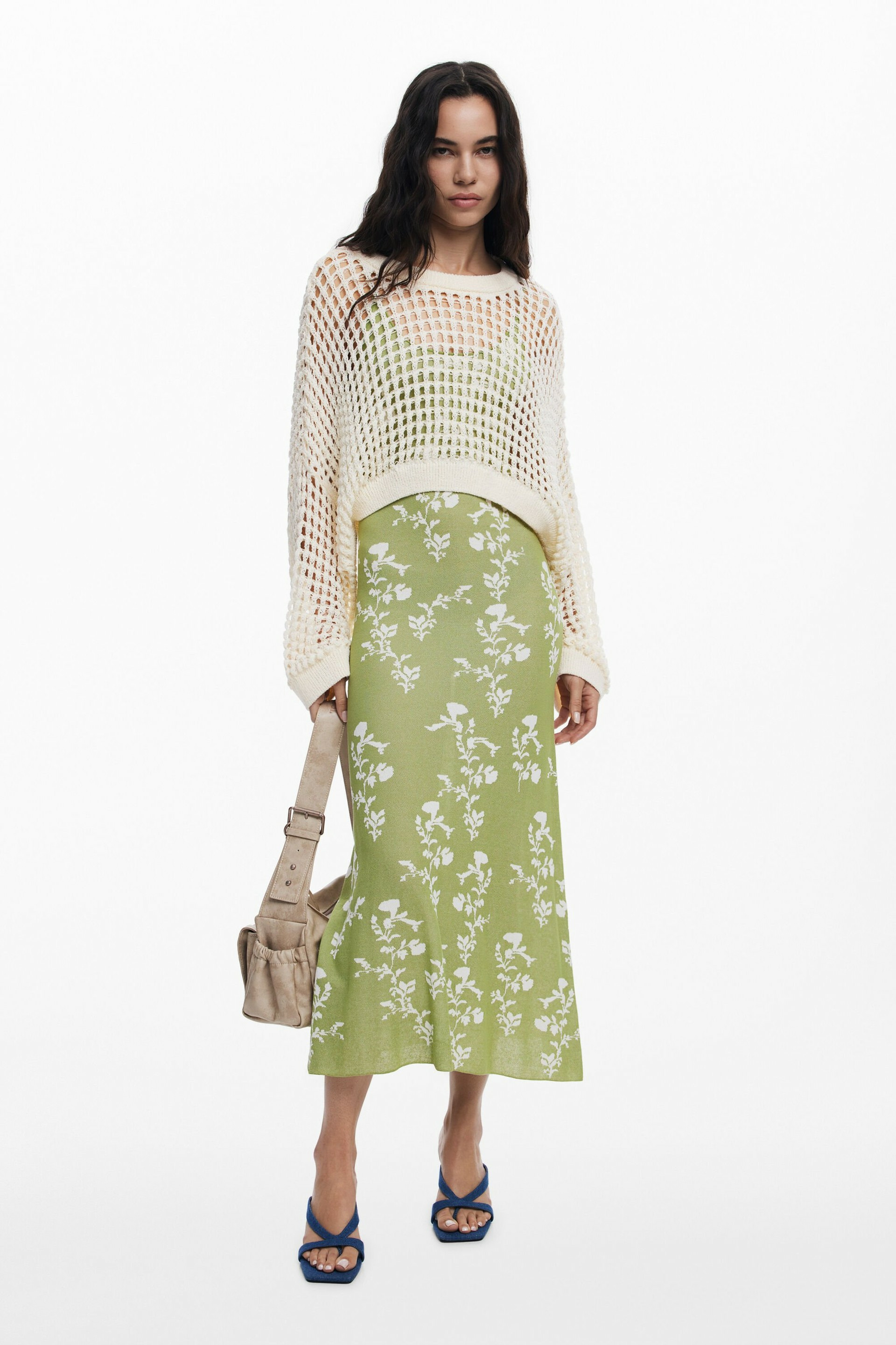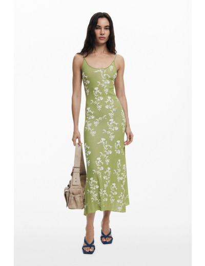 Laissez-vous séduire par l’élégance légère de cette robe longue style nuisette, sublimée par un imprimé floral mini délicat et un dos ouvert audacieux. Associez-la au pull cropped en crochet ton naturel pour un look estival raffiné et décontracté.