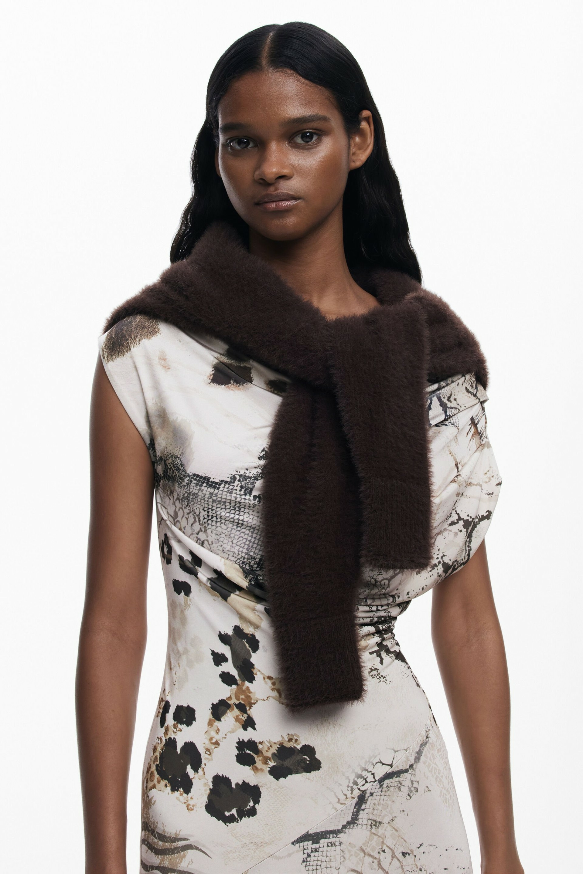 Cette robe longue à manches longues se transforme grâce à un pull en peluche amovible, offrant deux styles en un seul vêtement. Le contraste entre la légèreté de la nuisette et la douceur du pull crée un look unique, parfait pour passer de la journée au soir sans compromis sur le style. Son imprimé animalier dynamique et l’ourlet asymétrique soulignent votre féminité tout en affirmant votre personnalité.