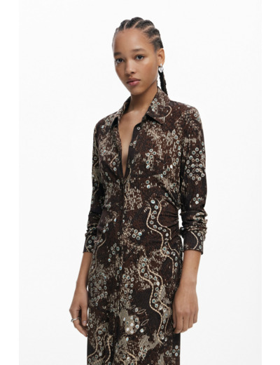 Conçue pour allier confort et style, cette robe Desigual se distingue par sa coupe fluide et ses manches longues qui apportent une touche de raffinement. Le tissu léger et la texture brillante captent la lumière, révélant un motif serpent subtil qui dynamise votre tenue, idéale pour une journée au bureau ou une soirée urbaine.