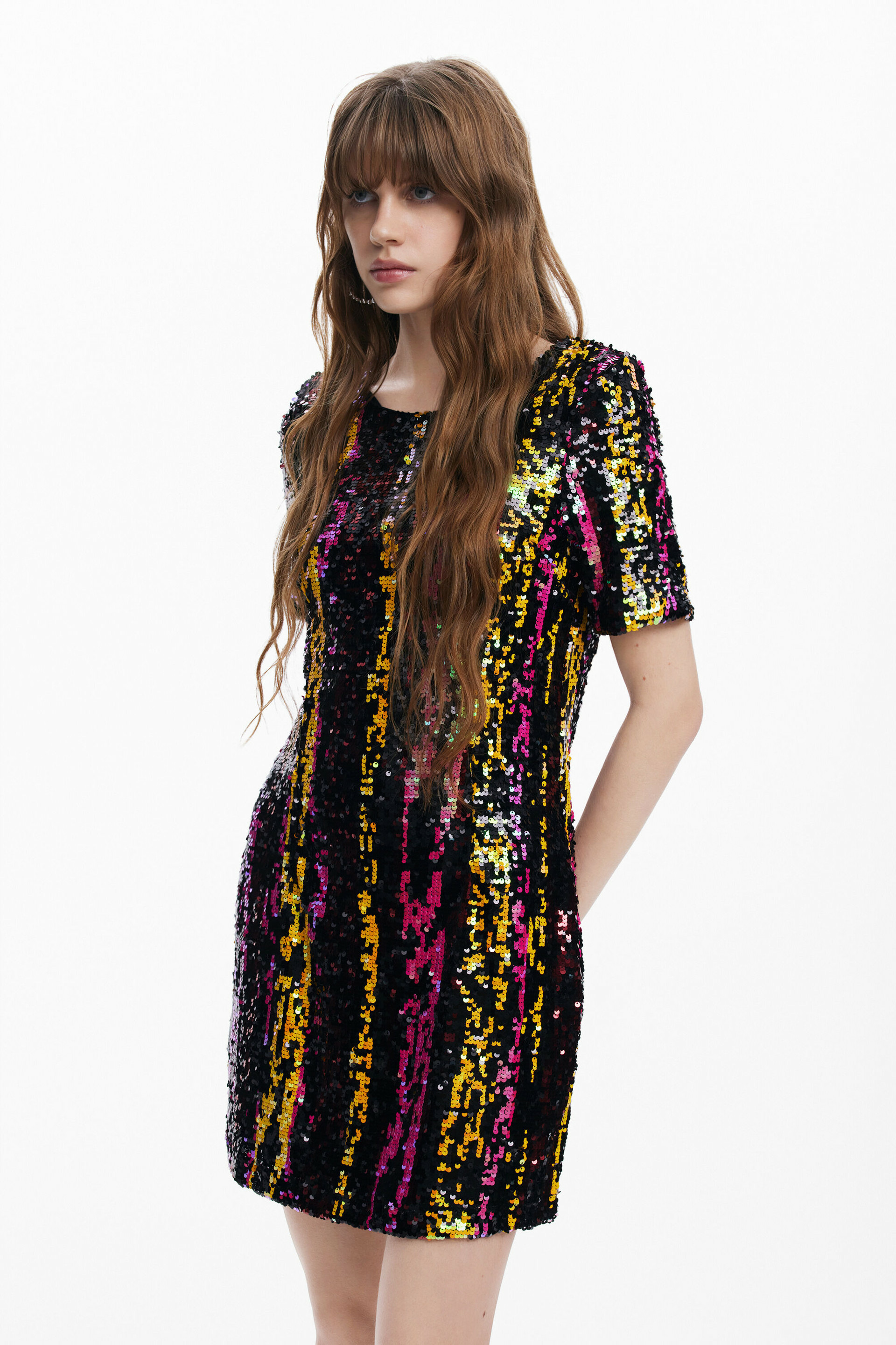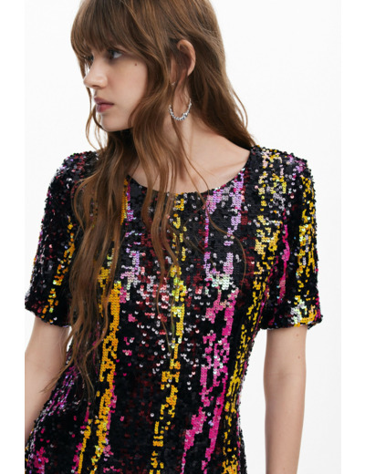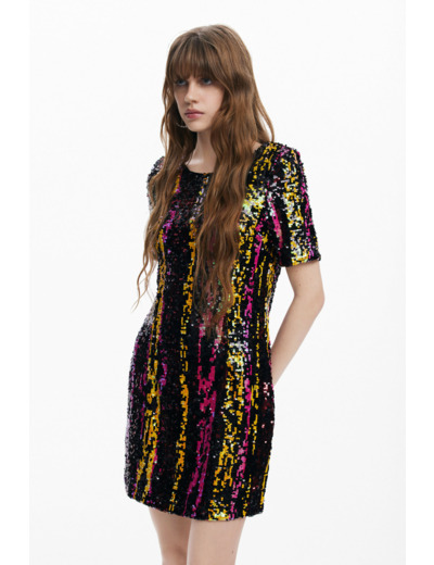 Lavage à la main à froid, à l’envers. Robe courte à manches courtes avec sequins contrastants. Col rond. Fermeture éclair au dos. Marque : Desigual.