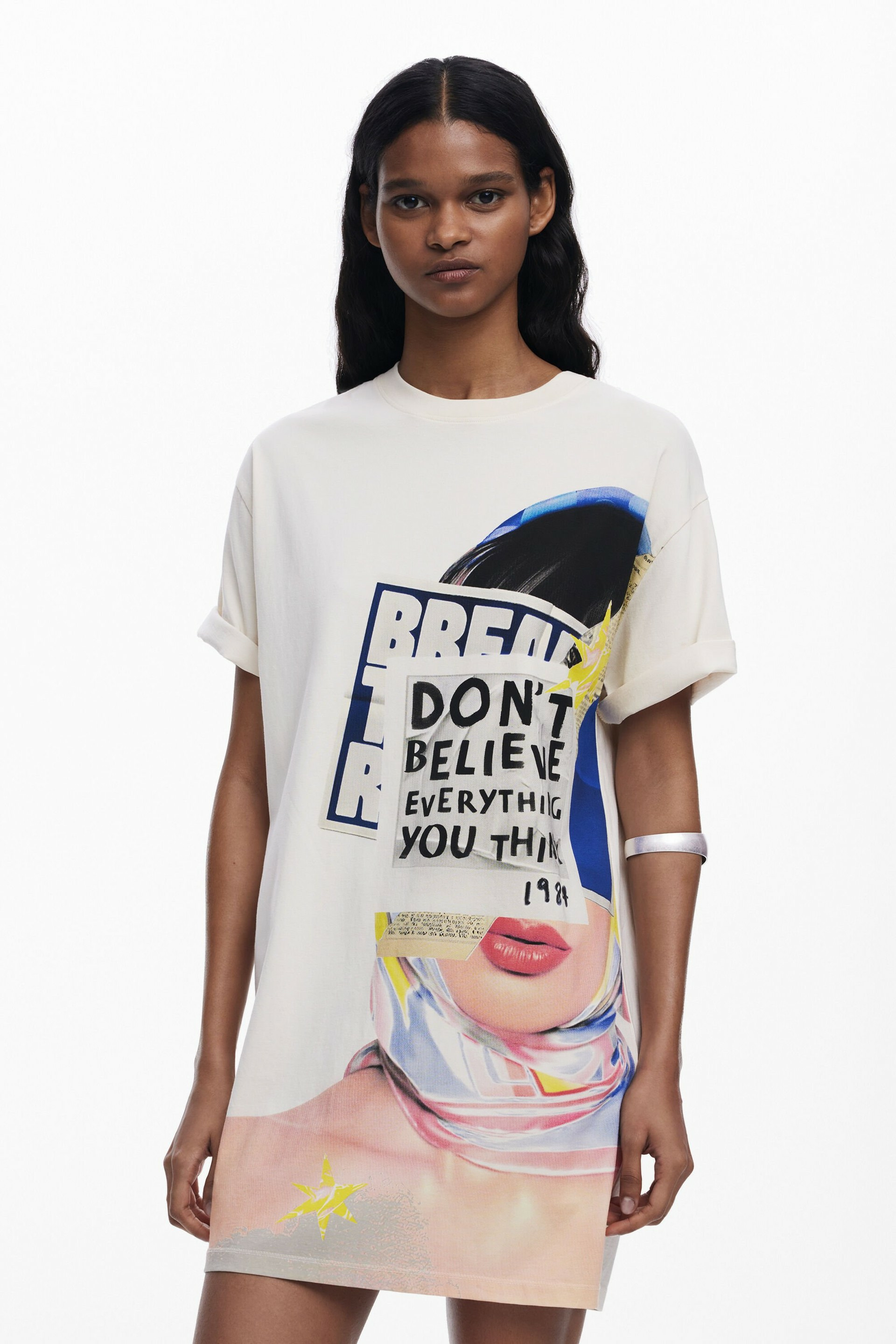 Conçue pour allier confort et originalité, cette robe à manches courtes se distingue par sa sérigraphie expressive qui capte le regard. Sa coupe fluide et courte épouse la silhouette sans contrainte, idéale pour un look urbain et contemporain. Portez-la seule ou accessoirisez-la pour révéler votre personnalité.