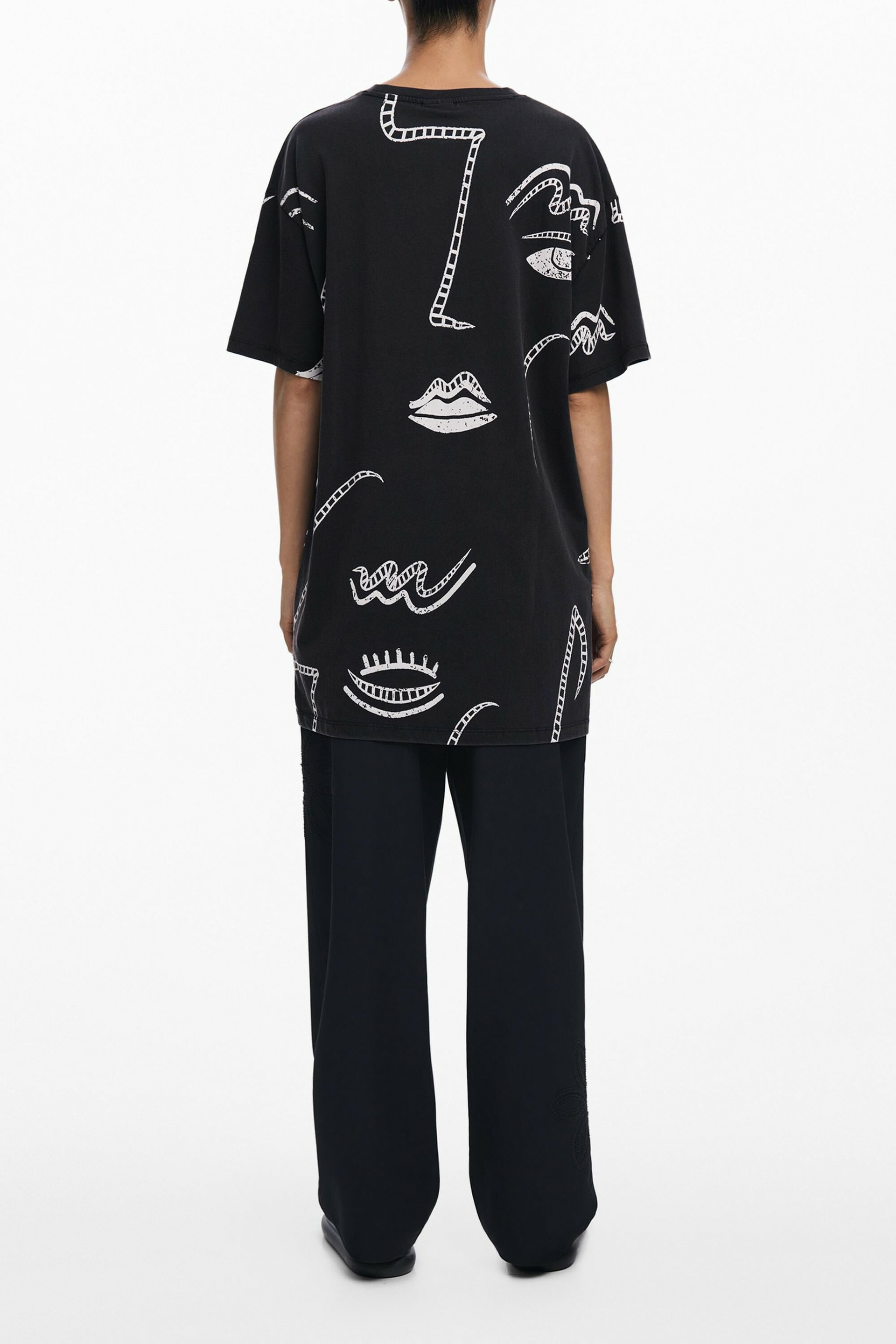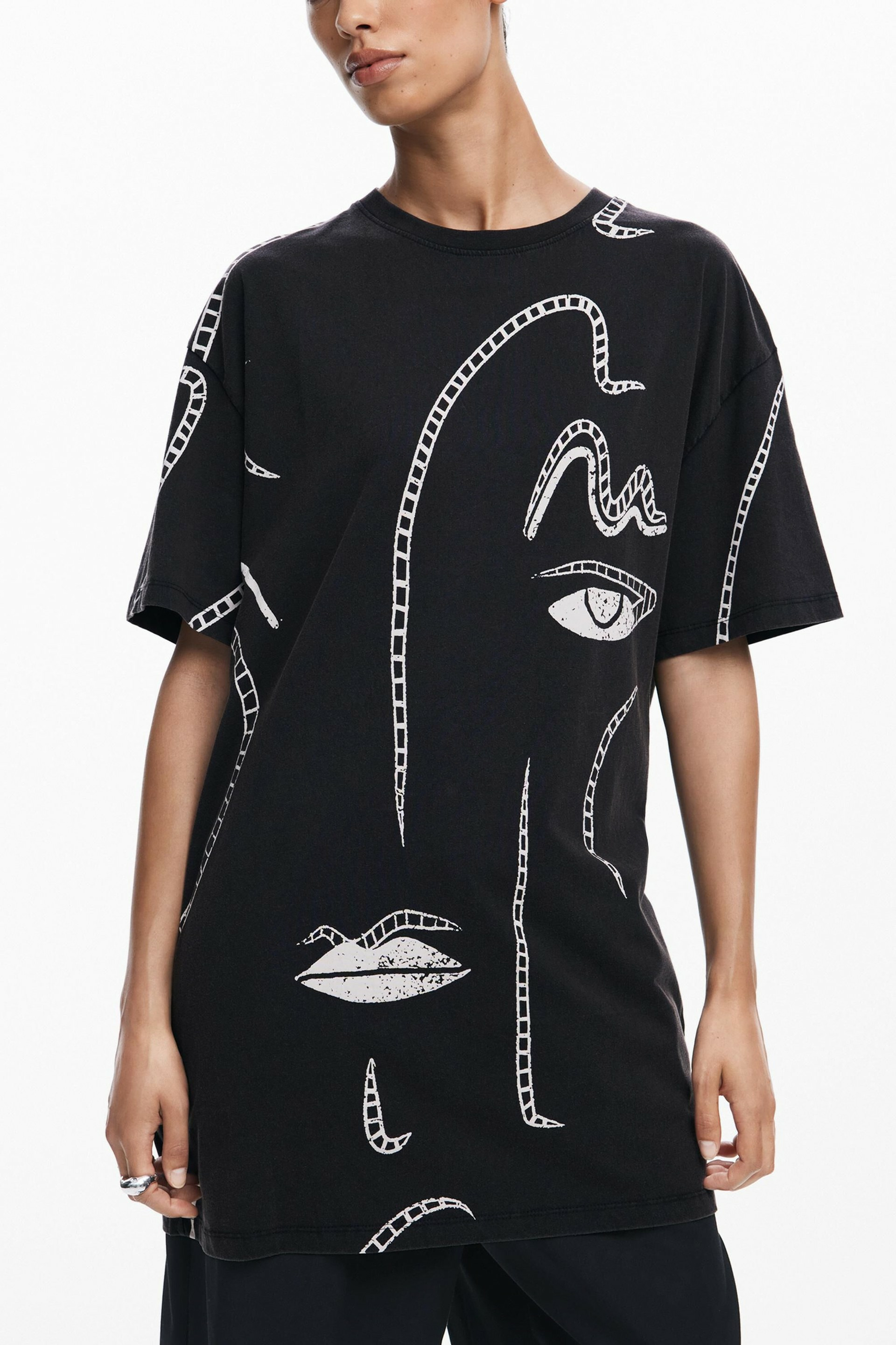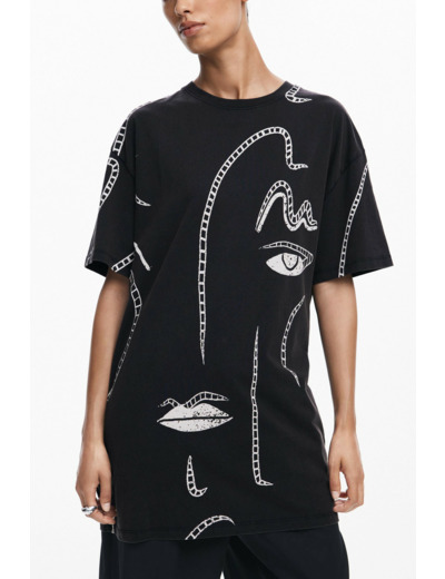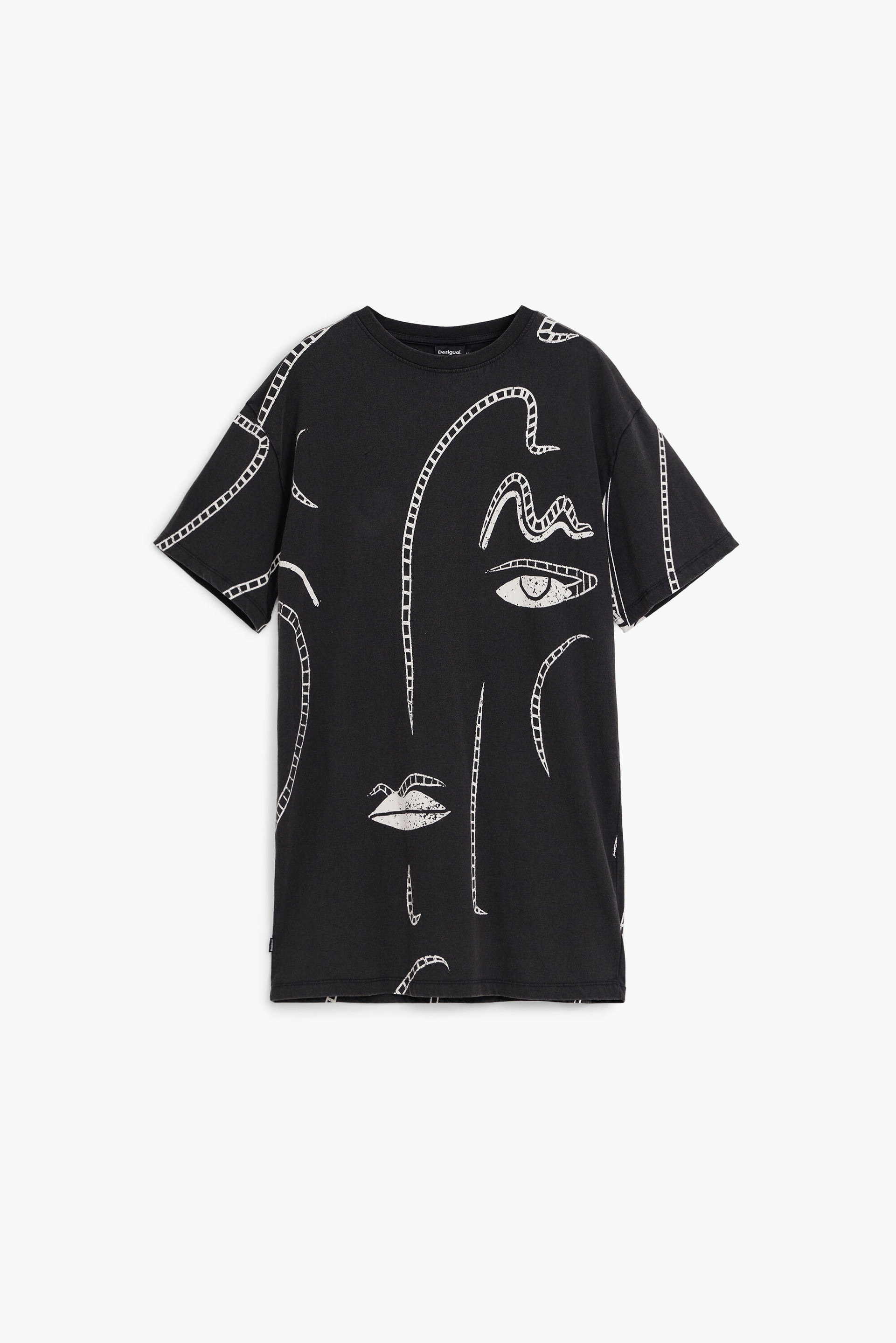 Affichez votre originalité avec cette robe à manches courtes et col rond, sublimée par un imprimé de figures illustrées unique. Une pièce qui allie audace et confort pour un style affirmé au quotidien.