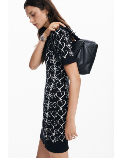 Conçue par Desigual, cette robe se distingue par son col rond classique et ses manches courtes, parfaits pour les journées ensoleillées ou les soirées décontractées. Le motif en colonnes de fleurs et cœurs apporte une touche artistique et féminine, tandis que la maille douce épouse le corps sans contrainte. Son allure unique s’adapte aussi bien à un look urbain qu’à une tenue plus sophistiquée.