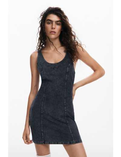 Affichez un style urbain et décontracté avec cette robe courte en denim effet délavé, parfaite pour vos journées ensoleillées. Sa coupe légère et ses bretelles fines offrent une silhouette féminine et moderne.