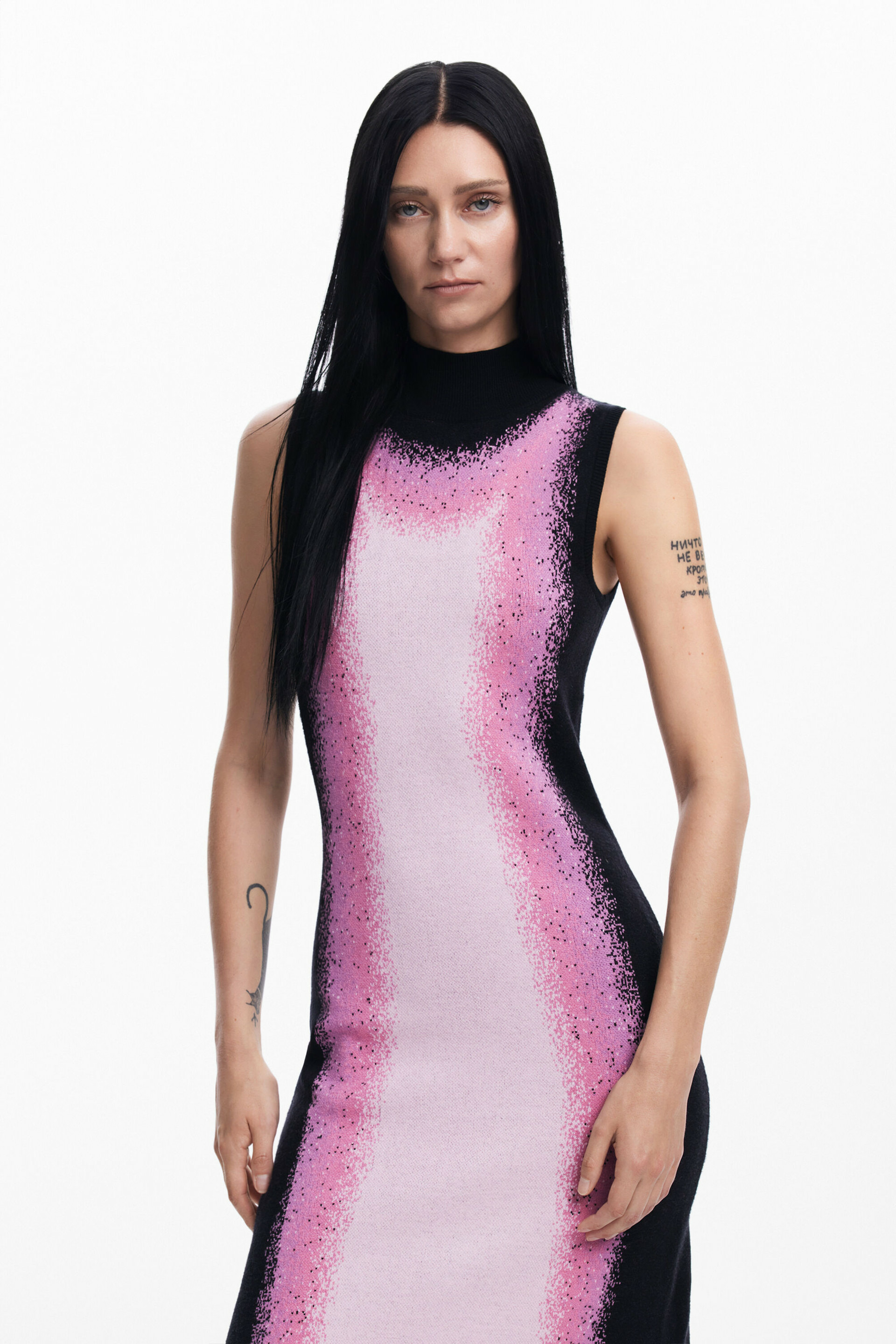 Conçue sans manches, cette robe fluide épouse délicatement le corps tout en offrant une liberté de mouvement optimale. Son col montant structure le buste avec finesse, tandis que le dégradé chromatique crée un effet visuel dynamique et sophistiqué. Parfaite pour passer de journées actives à soirées stylées sans compromis.