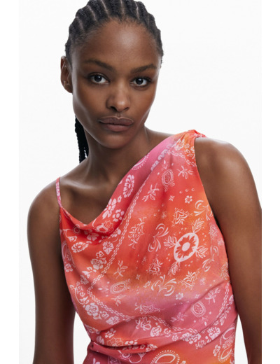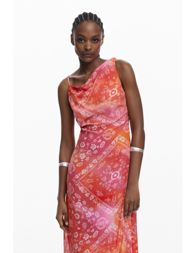 Affichez une allure unique avec cette robe midi à bretelles, sublimée par une encolure droite asymétrique et un imprimé bandana multicolore qui capte tous les regards. Une pièce Desigual qui allie audace et élégance pour vos journées et soirées.