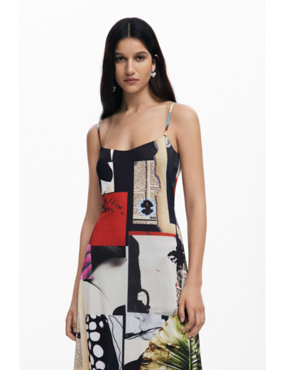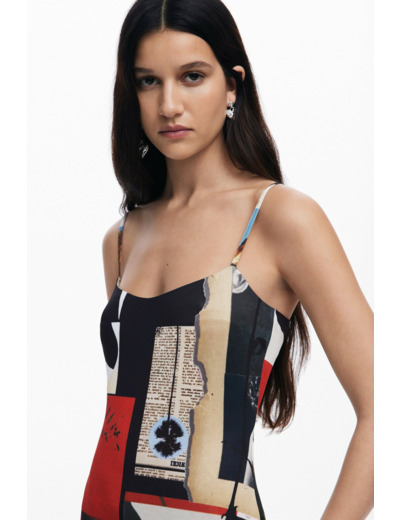 Conçue par Desigual, cette robe incarne la créativité et la qualité. Sa coupe fluide épouse délicatement la silhouette tandis que les bretelles ajustables assurent un maintien personnalisé. L’imprimé original, fruit de la collaboration avec Christian Lacroix, apporte une touche artistique et contemporaine à votre garde-robe.