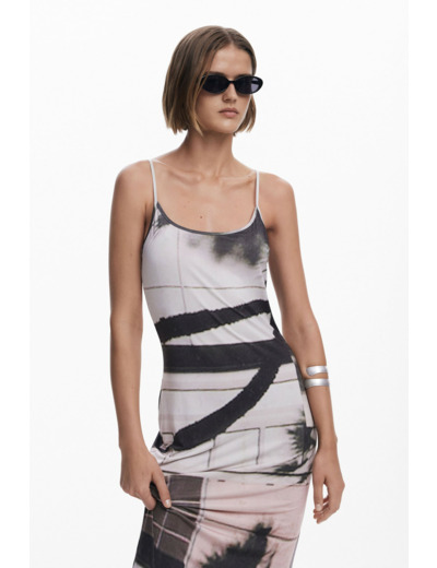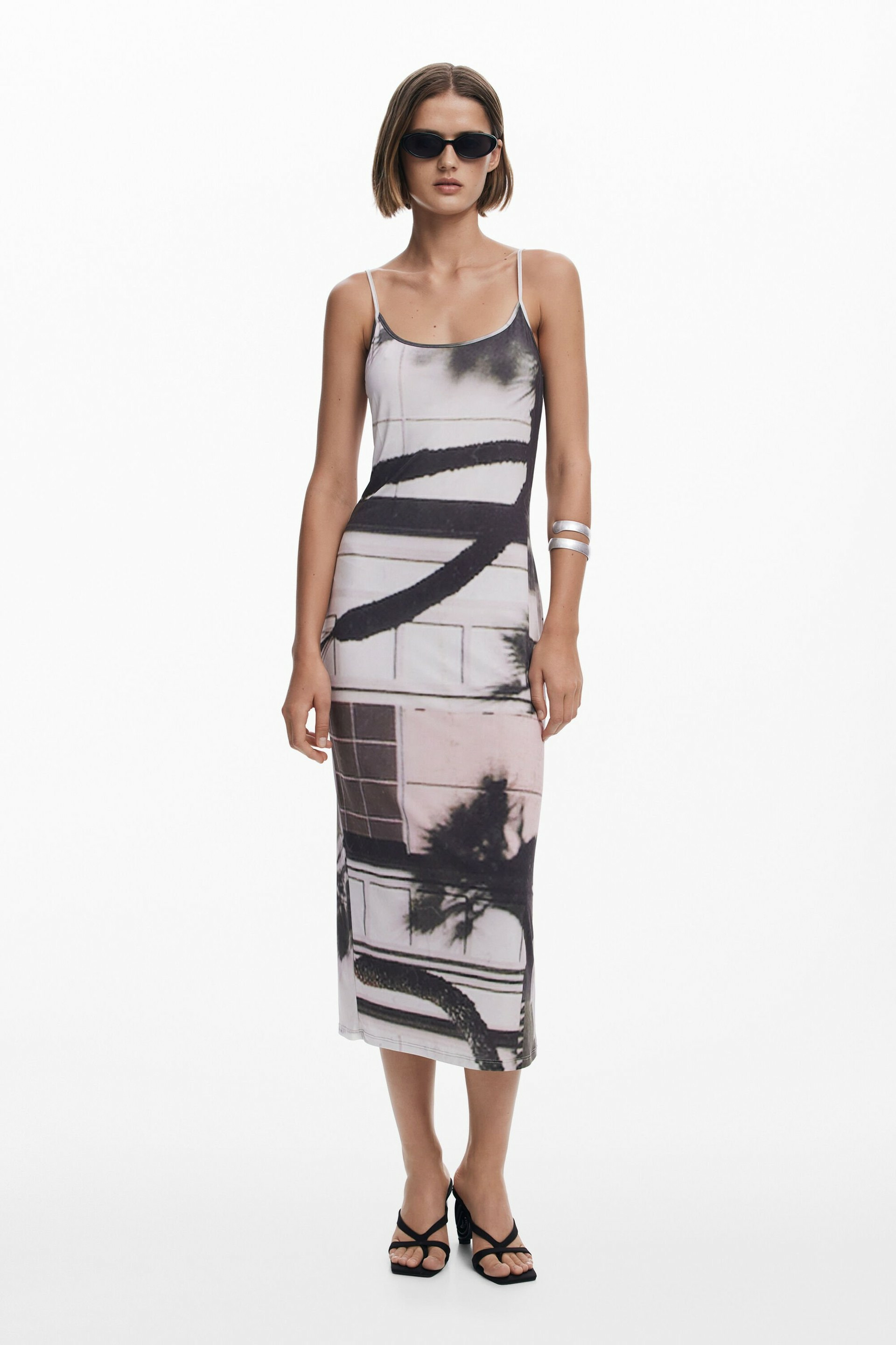 Lavage en machine à froid à l’envers, cycle très délicat. Matière légère et fluide, bretelles fines ajustables, col rond, longueur midi. Imprimé Arty de paysage urbain exclusif Desigual.