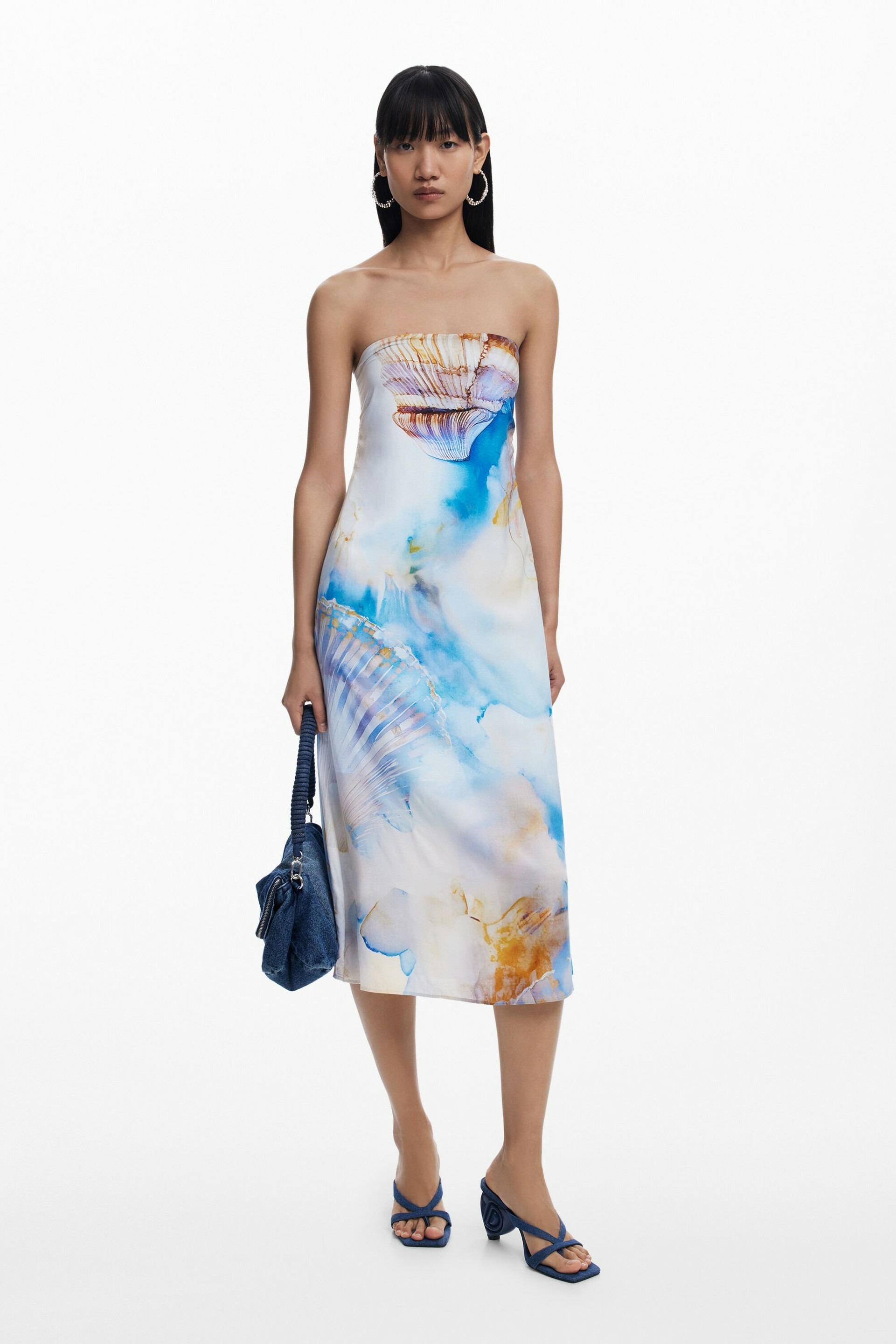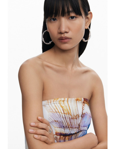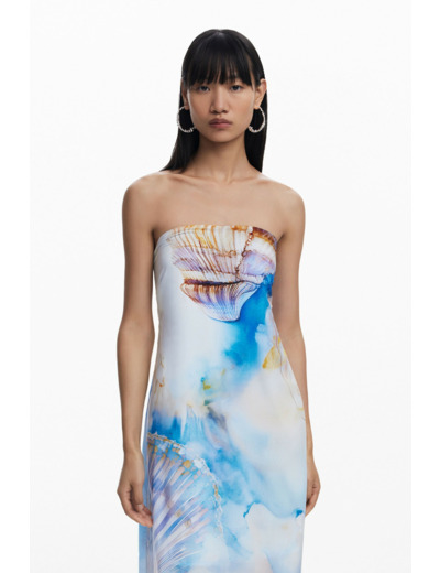 Laissez-vous séduire par cette robe midi à l’allure estivale, sublimée par un imprimé coquillages qui évoque les plages ensoleillées. Son encolure bardot sans bretelles dévoile élégamment les épaules pour un style à la fois frais et sophistiqué.