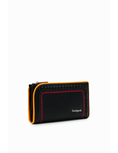 Dimensions adaptées pour un usage quotidien, fermeture à pression, plusieurs compartiments pour cartes, billets et monnaie. Matière effet cuir noir avec finitions contrastantes caractéristiques de la marque Desigual.