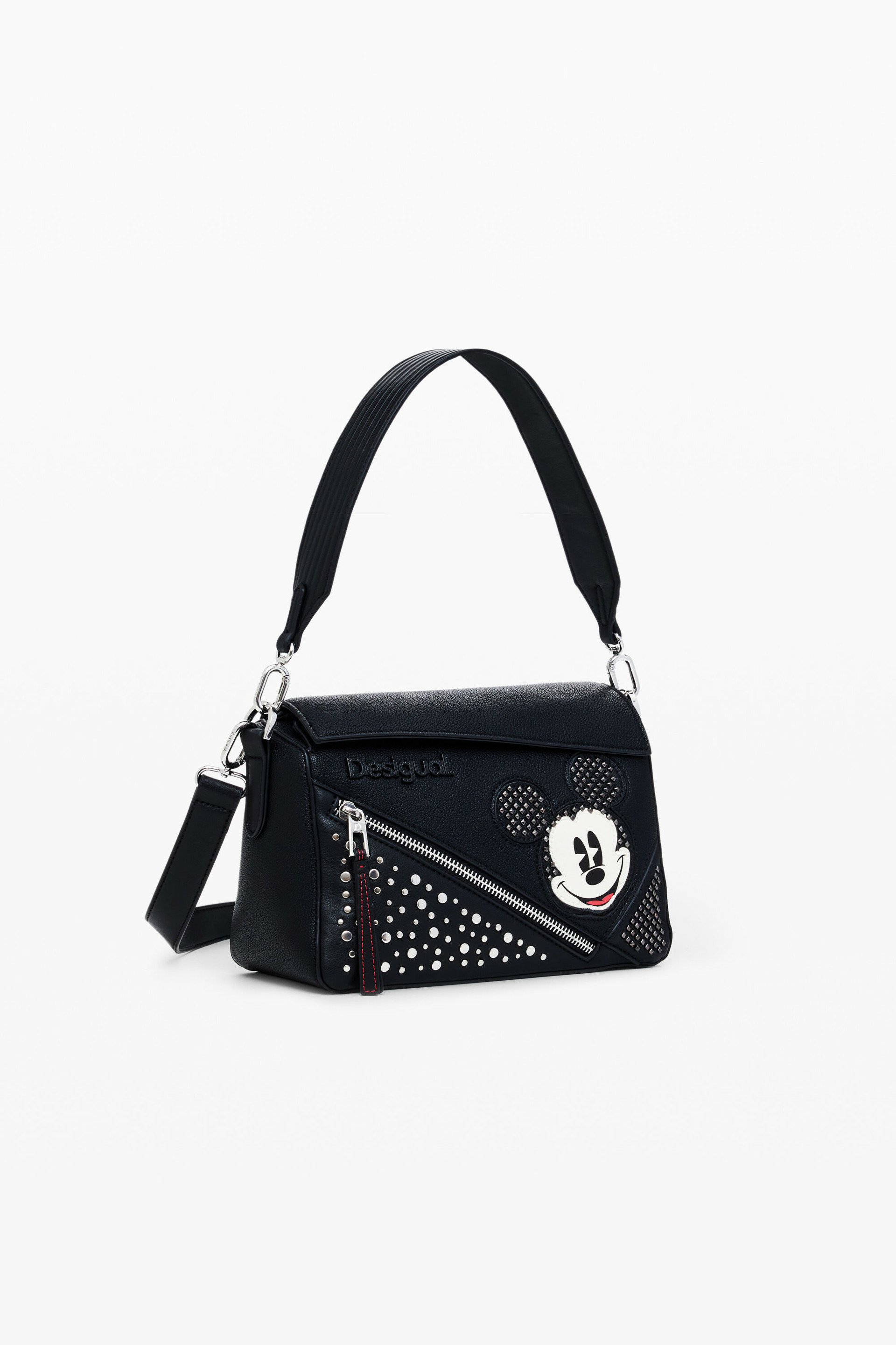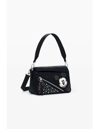 Dimensions moyennes, tissu effet cuir, clous métallisés, broderies, patch Mickey Mouse. Poches intérieures et extérieures. Poignée et bandoulière amovible. Ne pas laver.