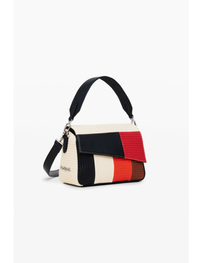 Dimensions, matériaux et entretien : sac à main avec fermeture à rabat et fermeture éclair, patchwork de textures variées, poignées interchangeables. Ne pas laver.