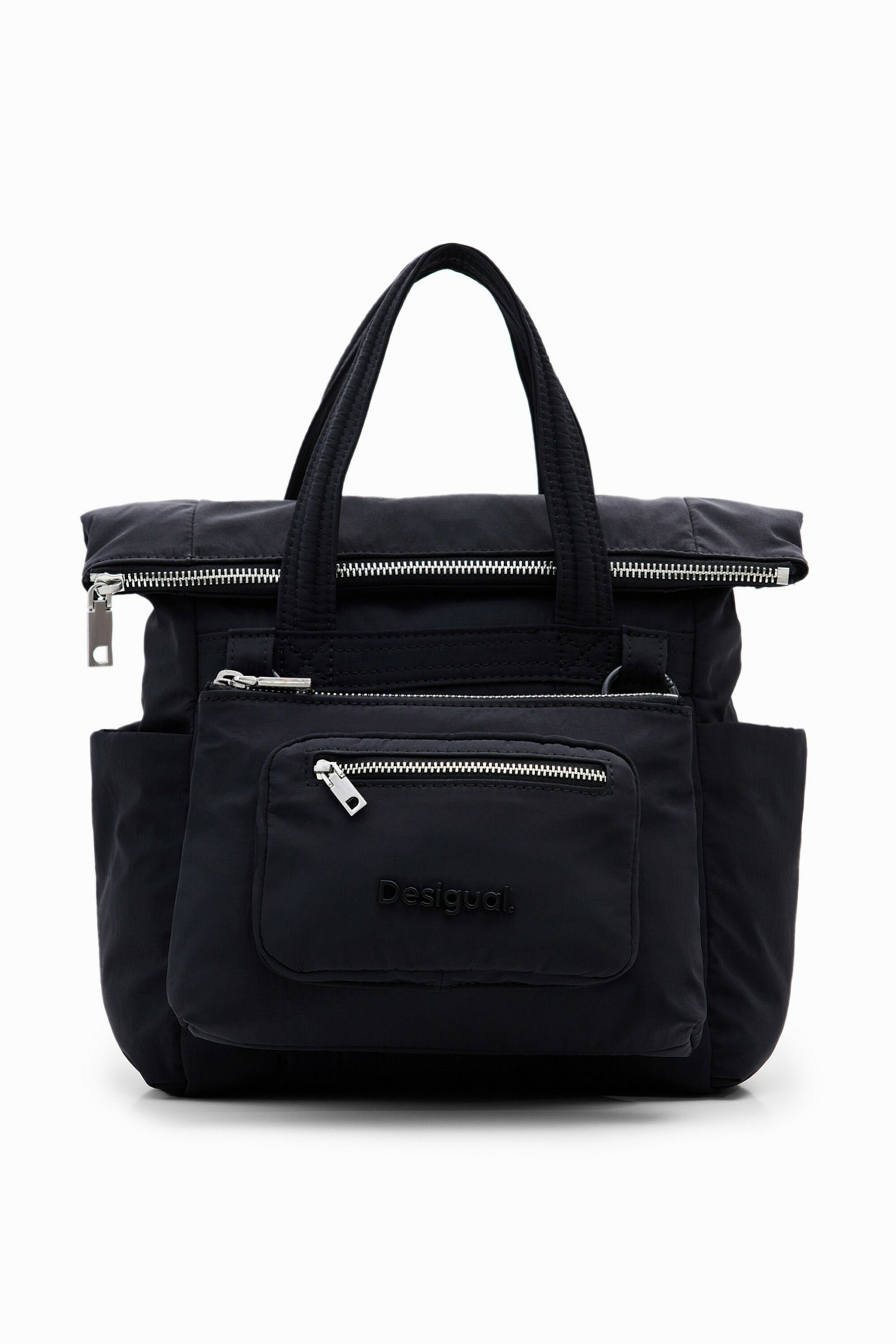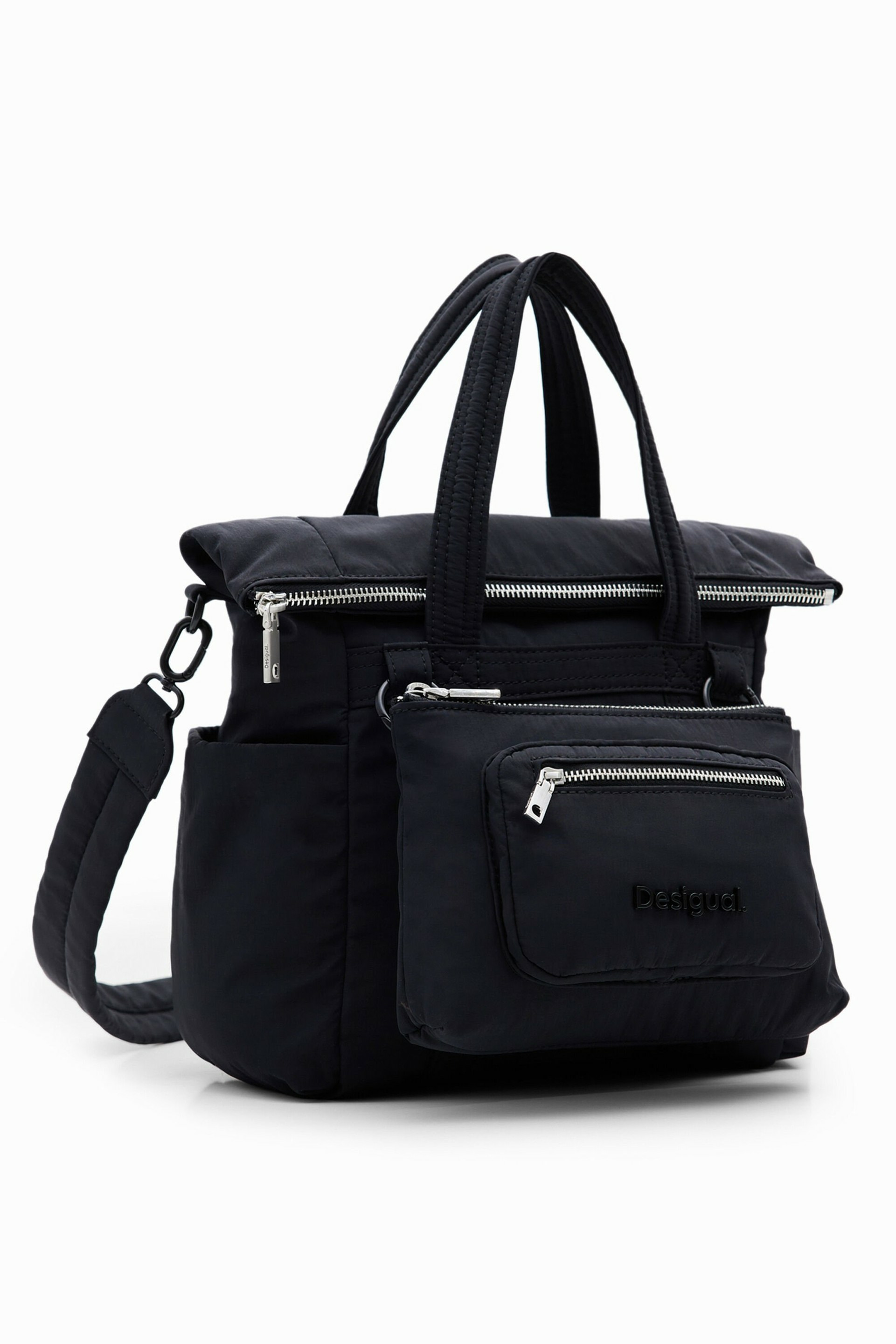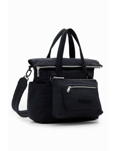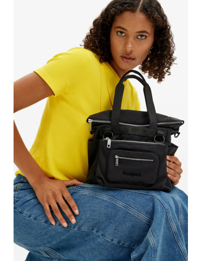 Conçu par Desigual, ce sac mêle une texture tressée sophistiquée à un cuir noir profond, offrant un contraste subtil grâce aux surpiqûres qui soulignent chaque détail. Sa silhouette compacte et épurée s’adapte parfaitement à toutes vos tenues, du bureau à vos sorties urbaines, pour une allure à la fois chic et décontractée.
