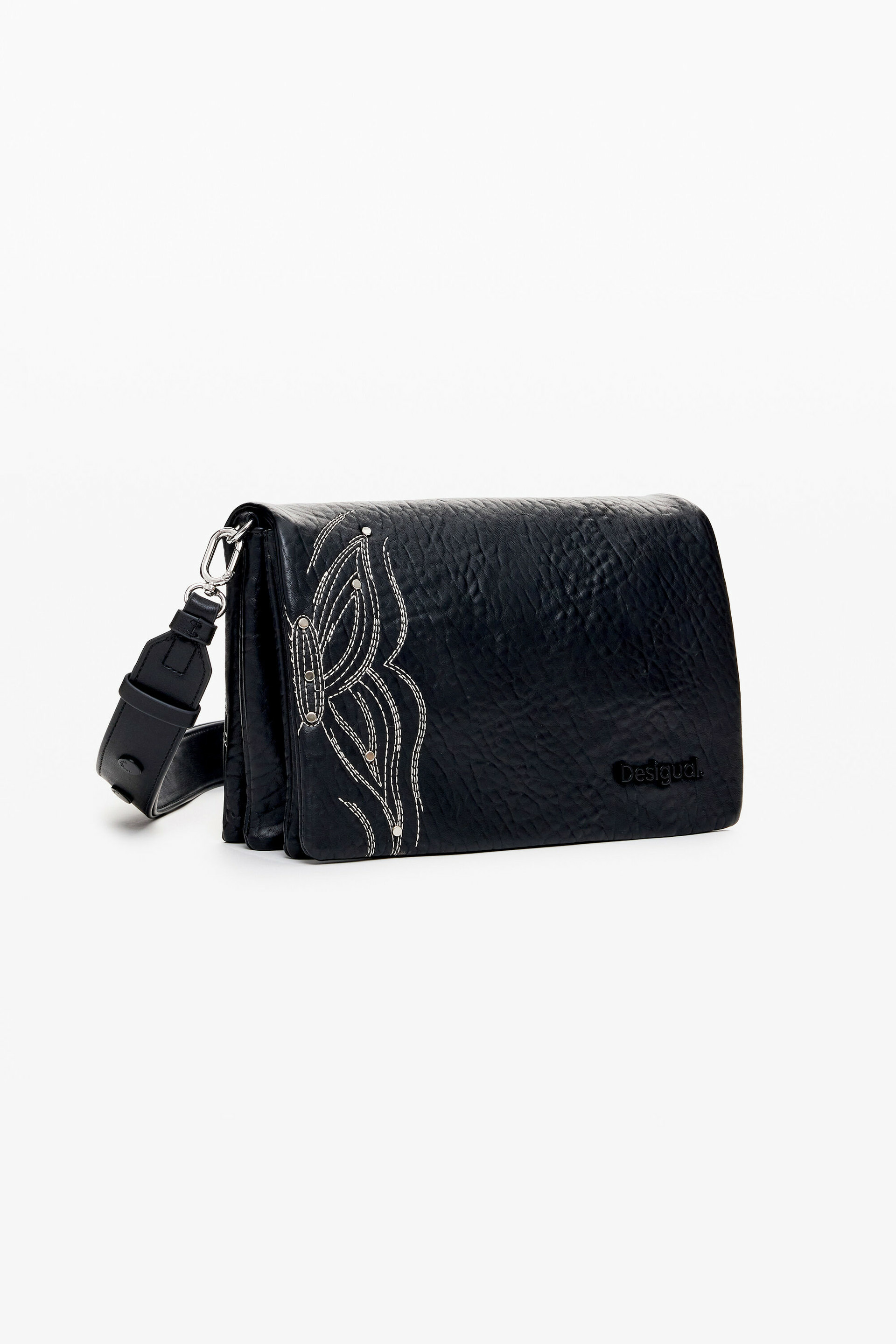 Dimensions et caractéristiques : sac en similicuir, poignée et bandoulière amovibles, fermeture éclair, imprimé papillon. Entretien : ne pas laver.