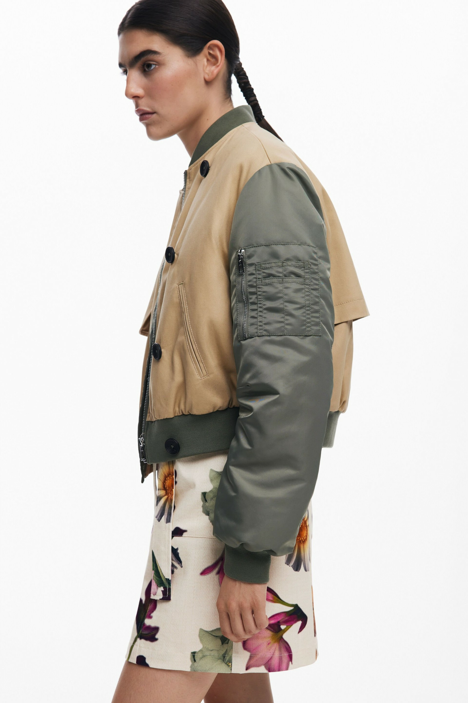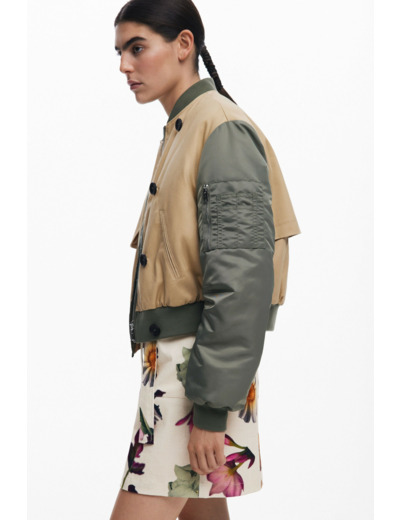 Conçu avec une combinaison de tissus soigneusement sélectionnés, ce blouson offre un équilibre subtil entre confort et originalité. La fermeture éclair associée aux boutons latéraux souligne sa polyvalence, tandis que les poches avant et la poche discrète sur la manche ajoutent une touche fonctionnelle et esthétique. La taille élastique et le col légèrement montant apportent une coupe ajustée et protectrice, idéale pour affronter les journées fraîches avec style.