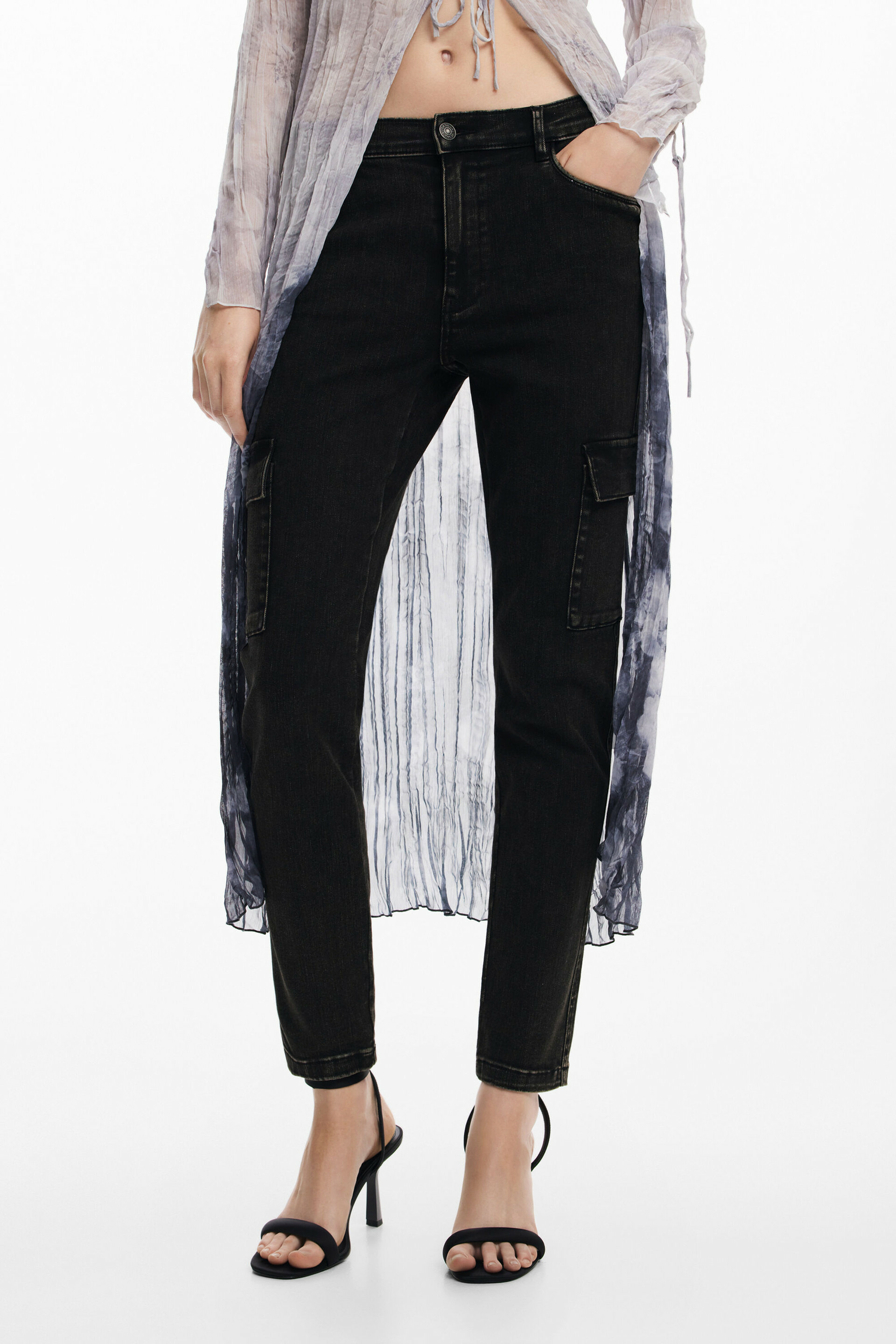 Lavage en machine à froid à l’envers, cycle délicat. Coupe droite. Fermeture à bouton et fermeture éclair. Denim délavé. Style cargo.