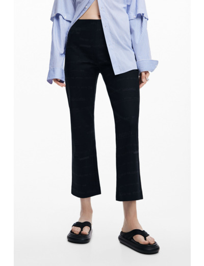 Affirmez votre style avec ce pantalon long à taille mi-haute, où l’élégance rencontre une touche audacieuse grâce à son imprimé de phrases contrastées. Sa coupe évasée modernise votre silhouette tout en offrant un confort inégalé.