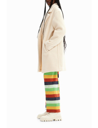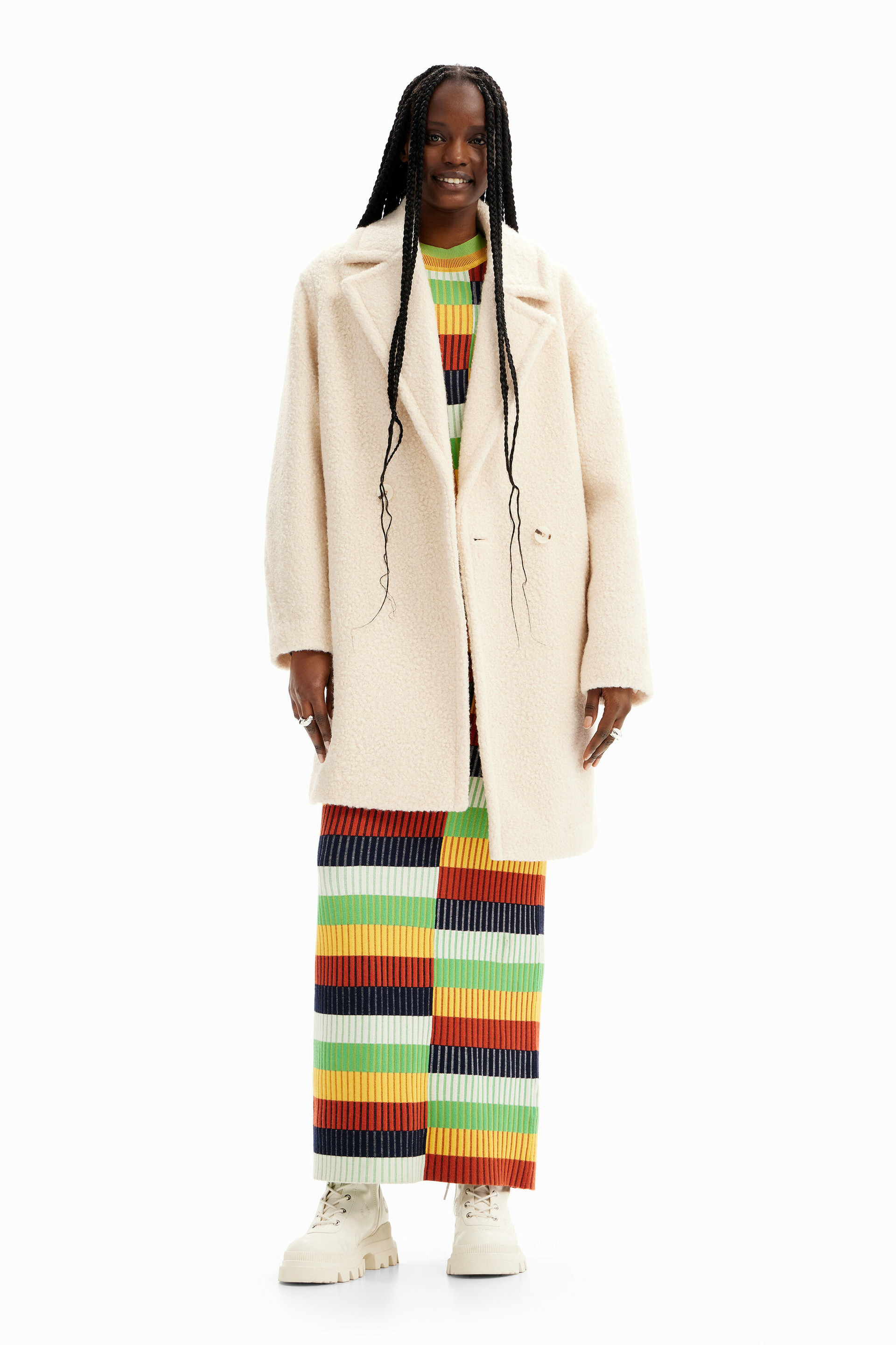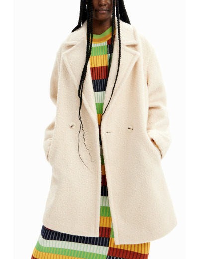 Manteau croisé en tissu effet bouclé, doublure intérieure intégrale, revers classiques, poches latérales. Entretien : ne pas laver.