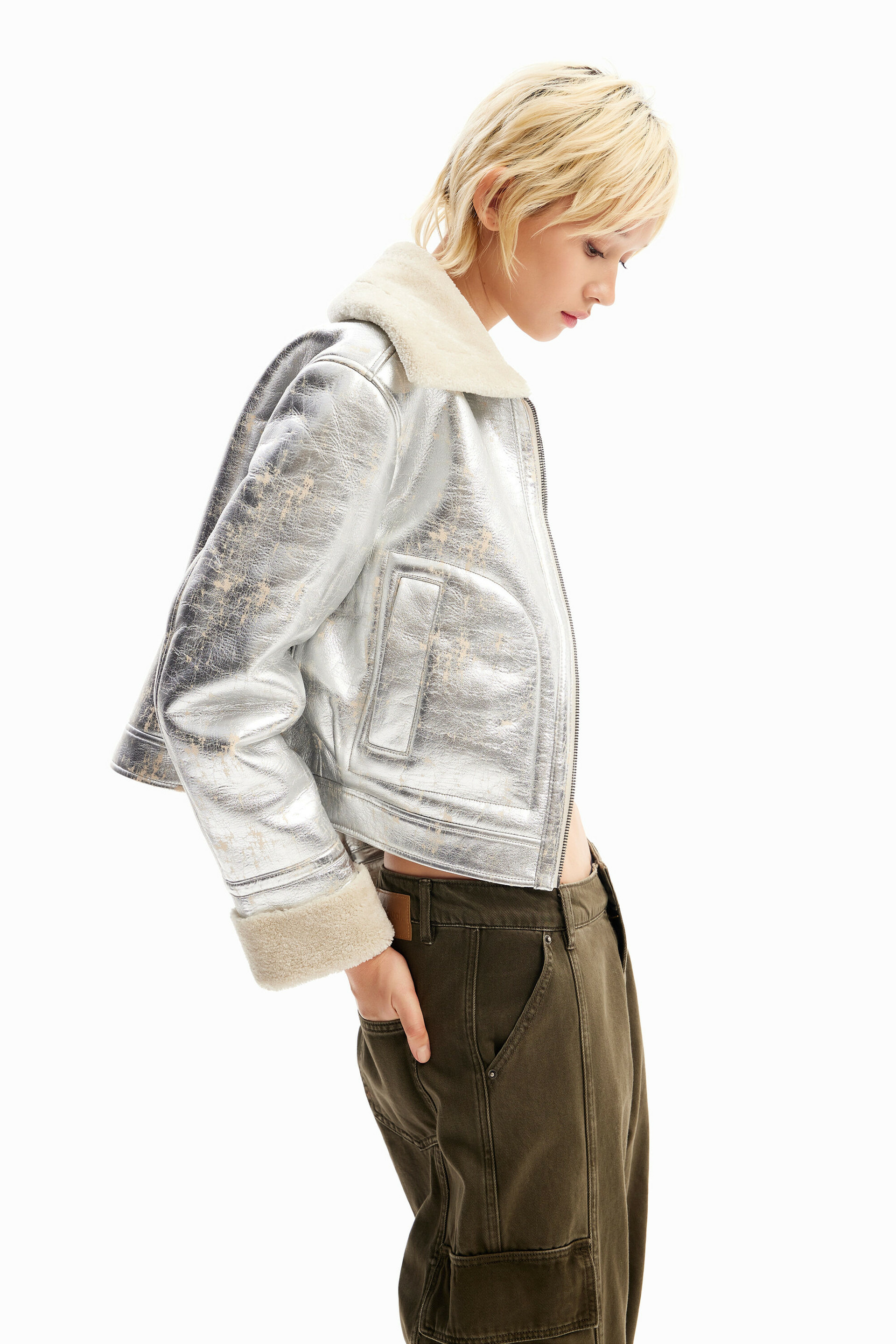 Manteau en PU effet métallisé, doublure en mouton synthétique, fermeture zippée, poches latérales, coupe cintrée, disponible en plusieurs tailles.