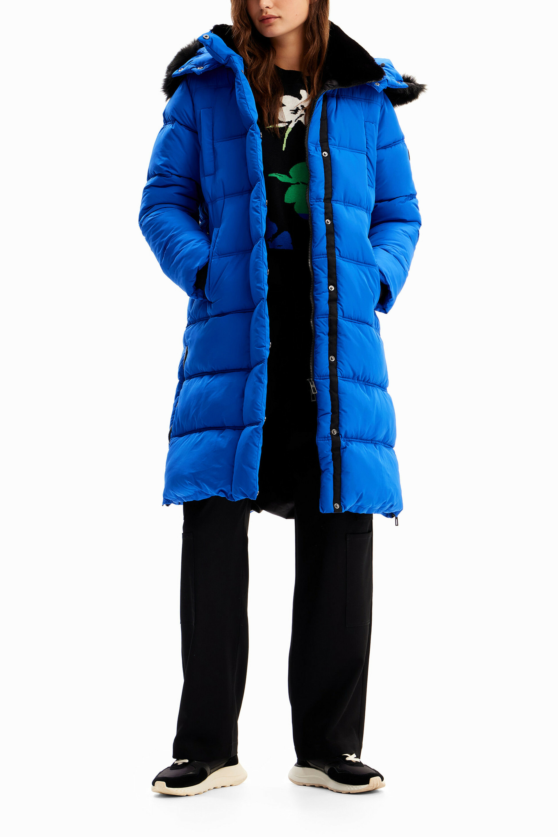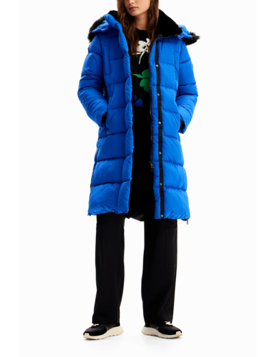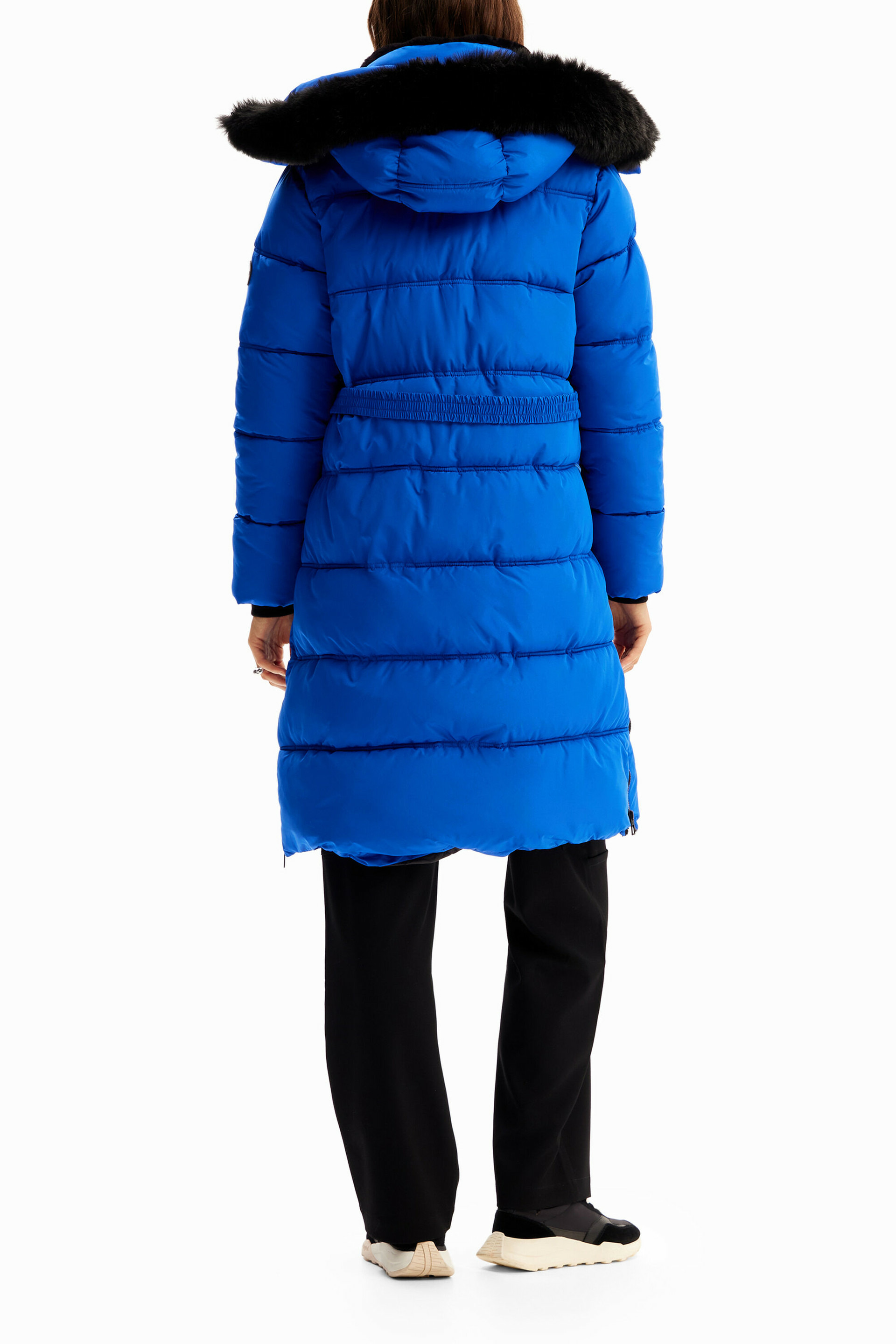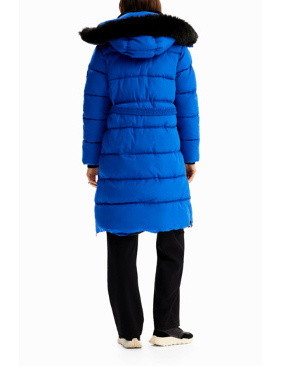 Manteau long matelassé bleu, capuche avec bordure effet fourrure, ceinture à nouer à la taille, fermeture zippée, poches latérales. Composition et entretien disponibles sur l’étiquette intérieure.