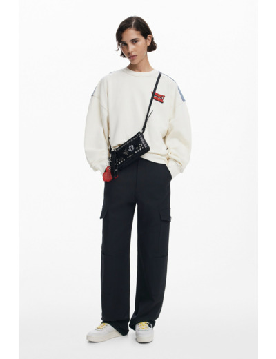 Réponse. Il est orné de clous métalliques et d’une broderie représentant Mickey Mouse™, emblème Disney™.