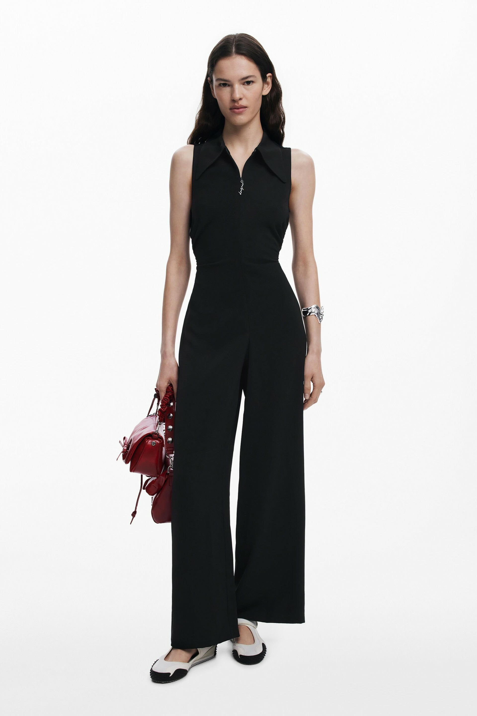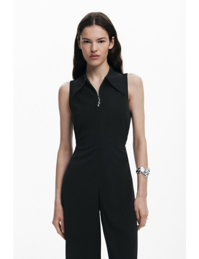 Adoptez l’élégance décontractée avec cette combinaison longue à coupe droite, sublimée par des fronces latérales qui sculptent la silhouette. Sa fermeture éclair frontale et son col de chemise en couleur unie apportent une touche moderne et raffinée à votre dressing.