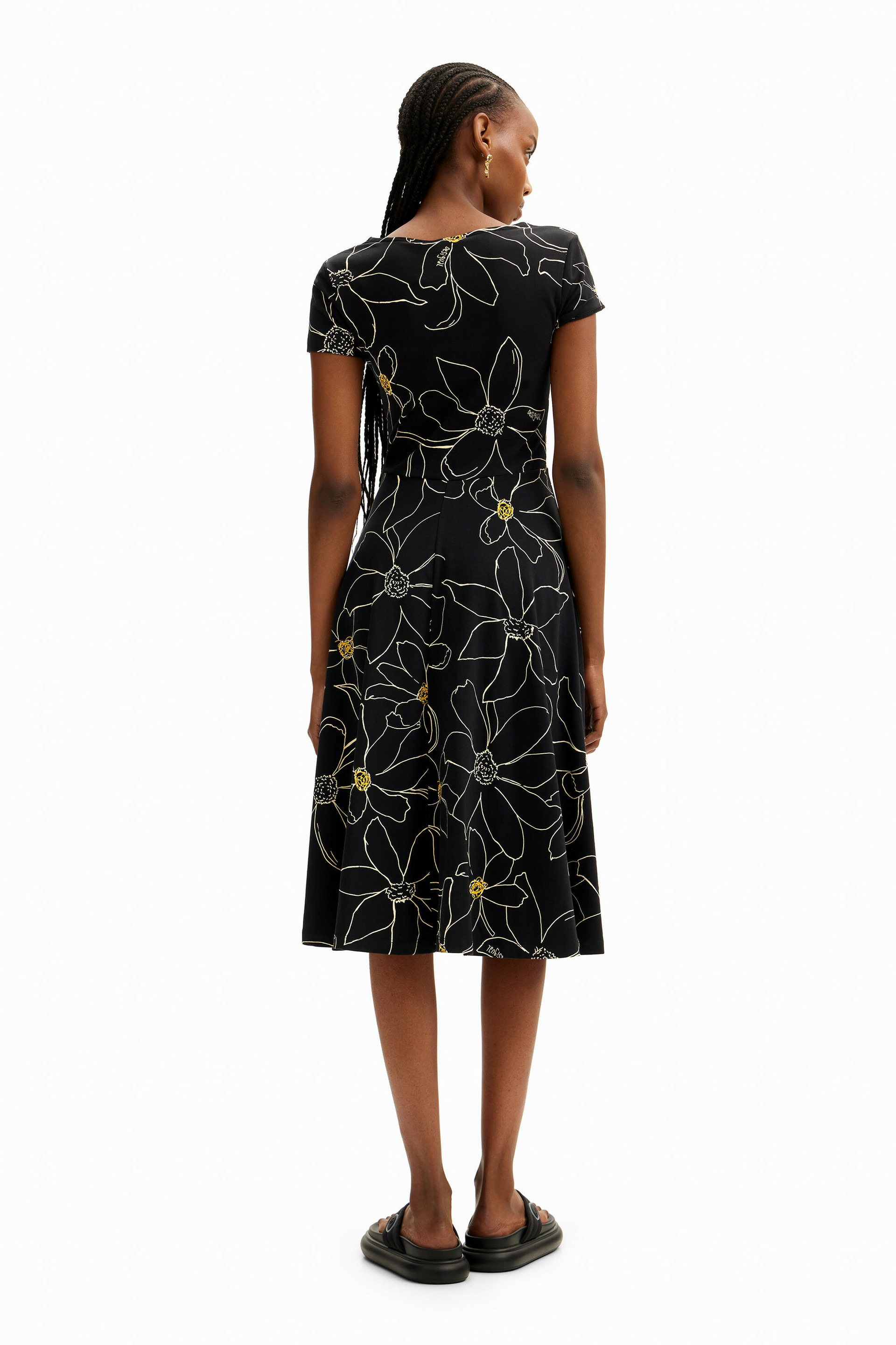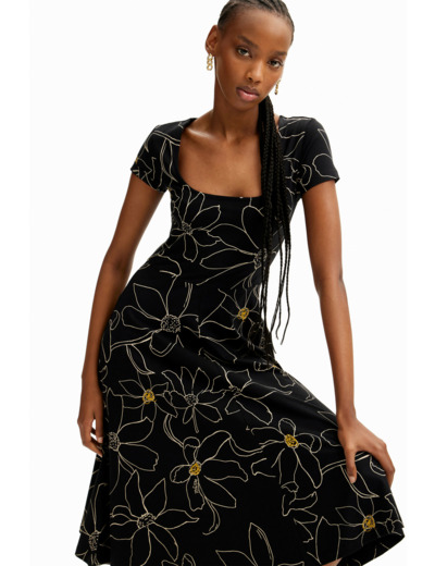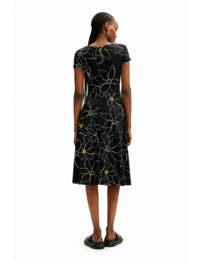 Robe courte manches courtes, coupe évasée, imprimé floral sur fond noir. Matière légère et respirante, idéale pour la saison printemps-été. Disponible dans plusieurs tailles selon la collection Femme SS24 Desigual.