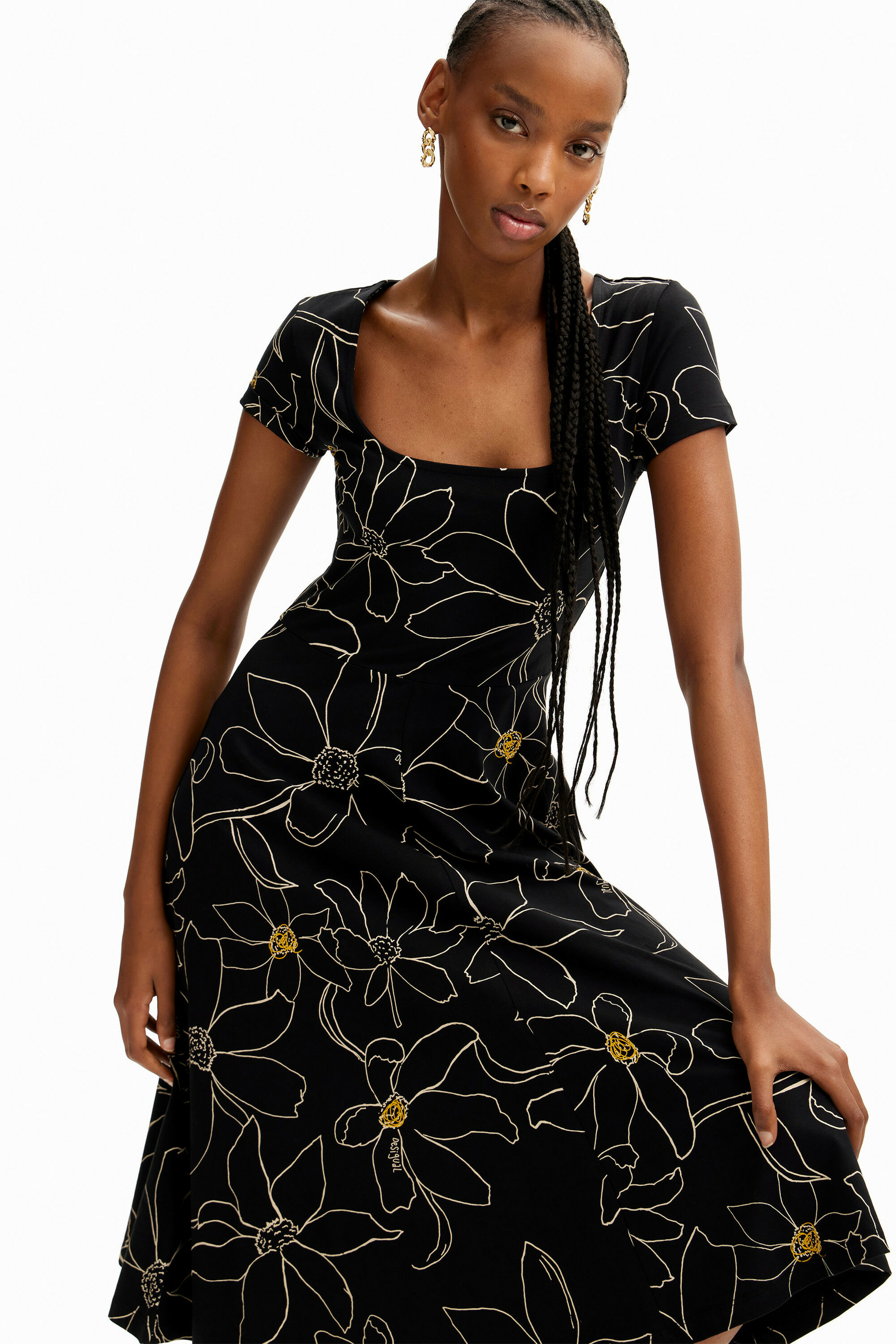 Affirmez votre style avec cette robe courte évasée noire à imprimé floral, pièce phare de la collection Femme SS24 Desigual. Une silhouette légère et féminine qui capte l’attention à chaque mouvement.
