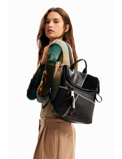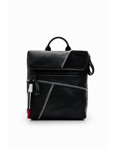 Un sac à dos qui allie audace et élégance grâce à son patchwork de tissus effet cuir aux textures variées. Chaque détail, des surpiqûres contrastantes au rabat structuré, affirme un style unique et contemporain.