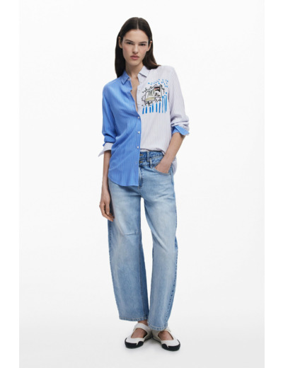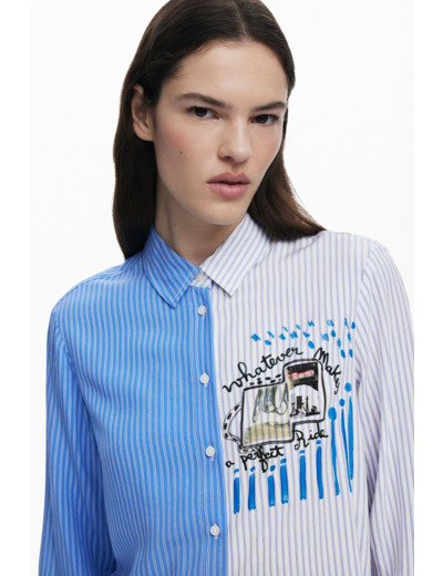 Conçue pour ceux qui veulent sortir du cadre, cette chemise Desigual combine deux univers graphiques en un seul vêtement. La moitié rayée apporte une verticalité élégante, tandis que le patchwork sur la poitrine crée un point focal original et dynamique. Les manches longues et le col chemise renforcent son allure structurée, idéale pour un style casual chic ou décontracté.