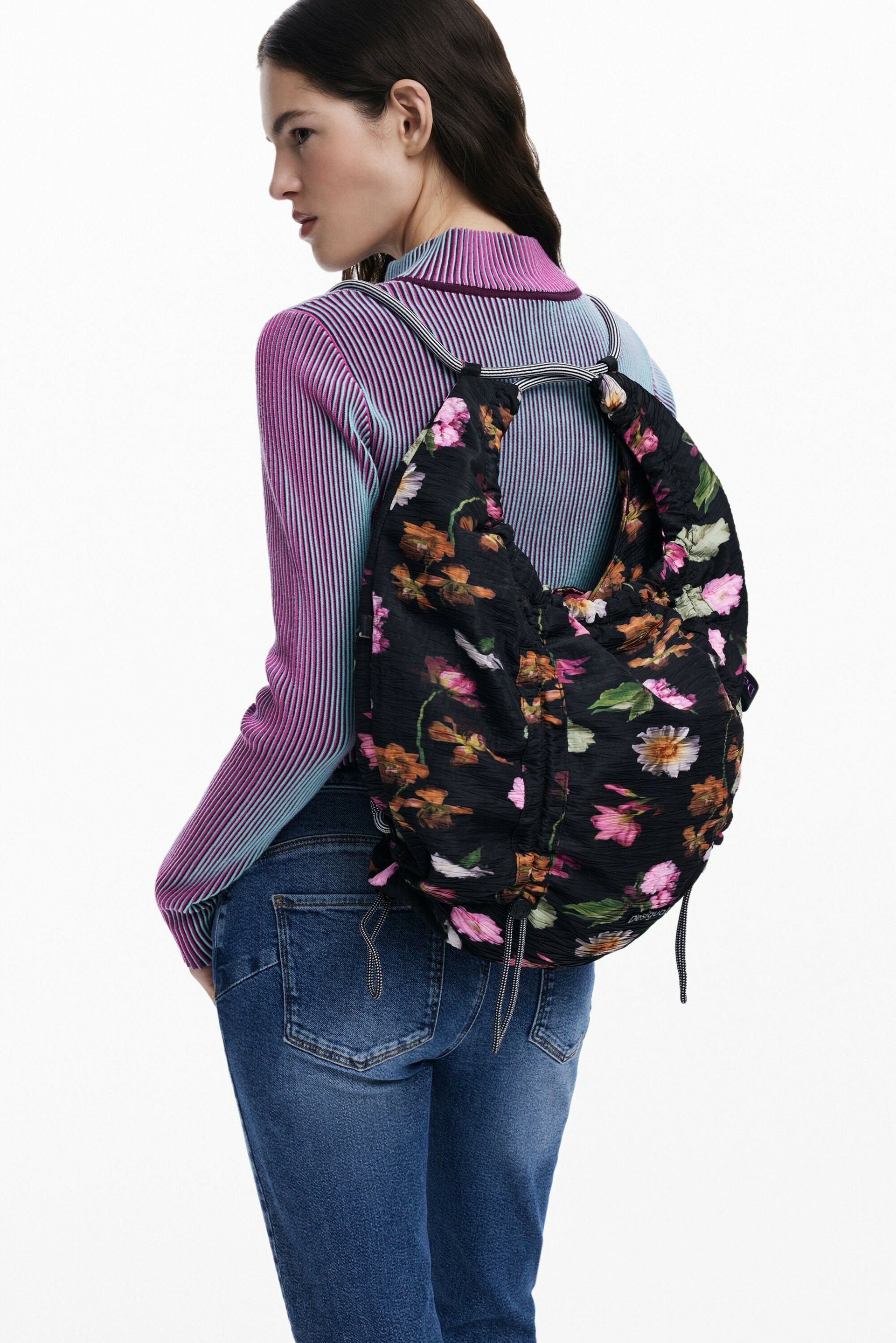Dimensions et entretien : tissu plissé, cordons ajustables, convertible en sac à dos. Lavage en machine à froid à l’envers, cycle très délicat.