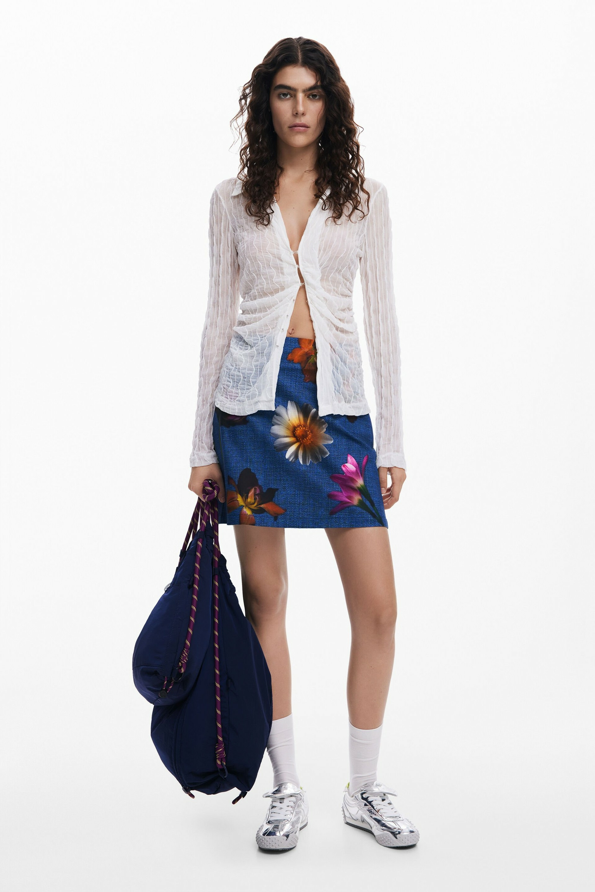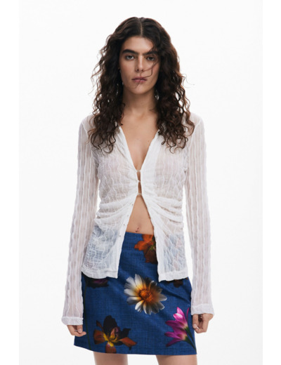 Conçue pour épouser vos formes, cette jupe dévoile des fronces délicates sur les hanches et une taille élastique qui assure un confort optimal toute la journée. Le toucher doux du tissu invite à la légèreté, tandis que l’ourlet asymétrique dynamise votre allure avec subtilité.