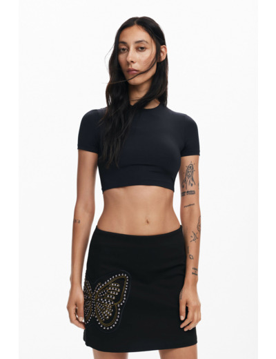 Affirmez votre style avec cette minijupe slim signée Desigual, sublimée par une broderie délicate de papillon et une fermeture éclair moderne. Une pièce audacieuse qui allie féminité et caractère pour vos looks urbains.