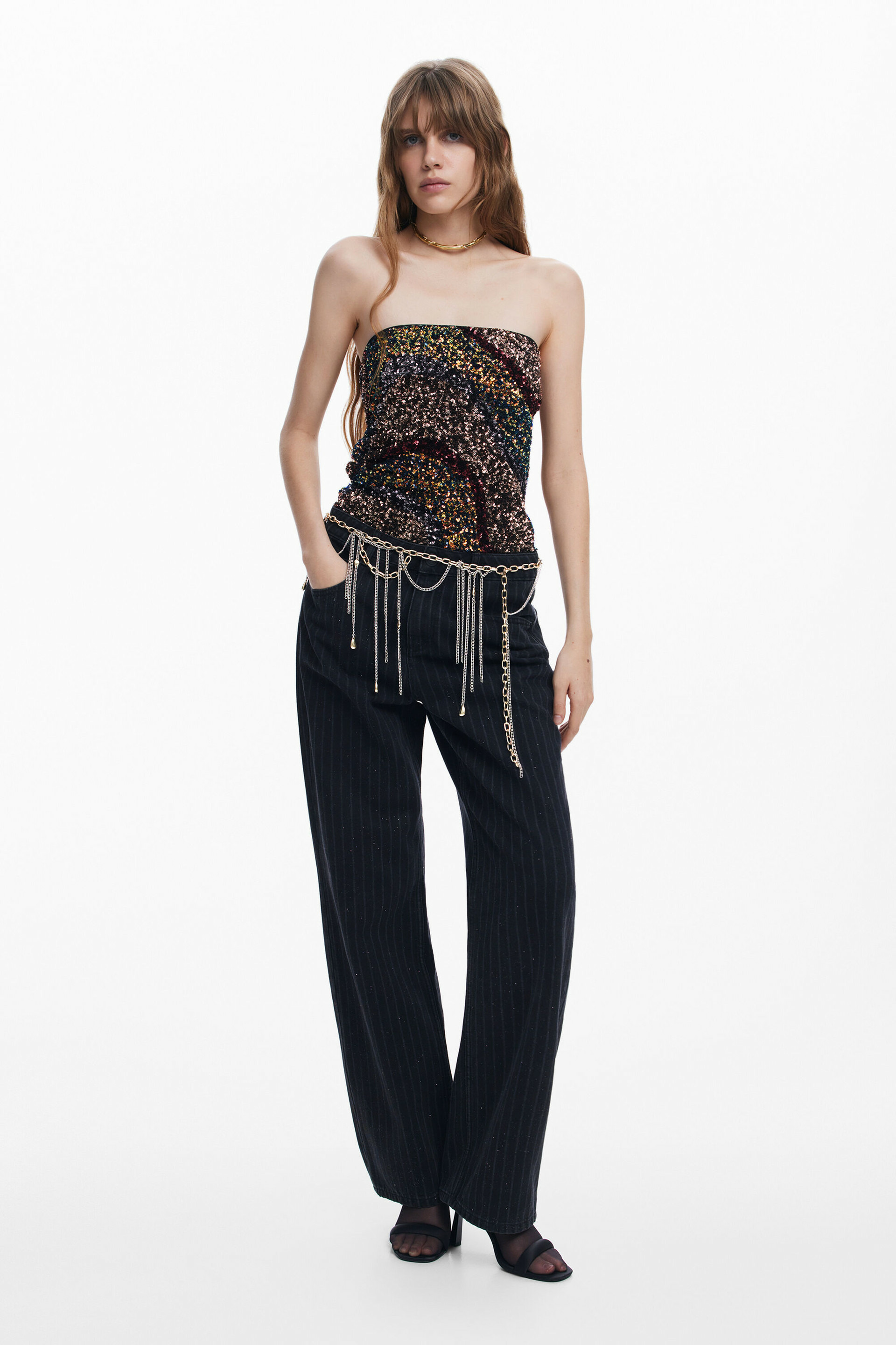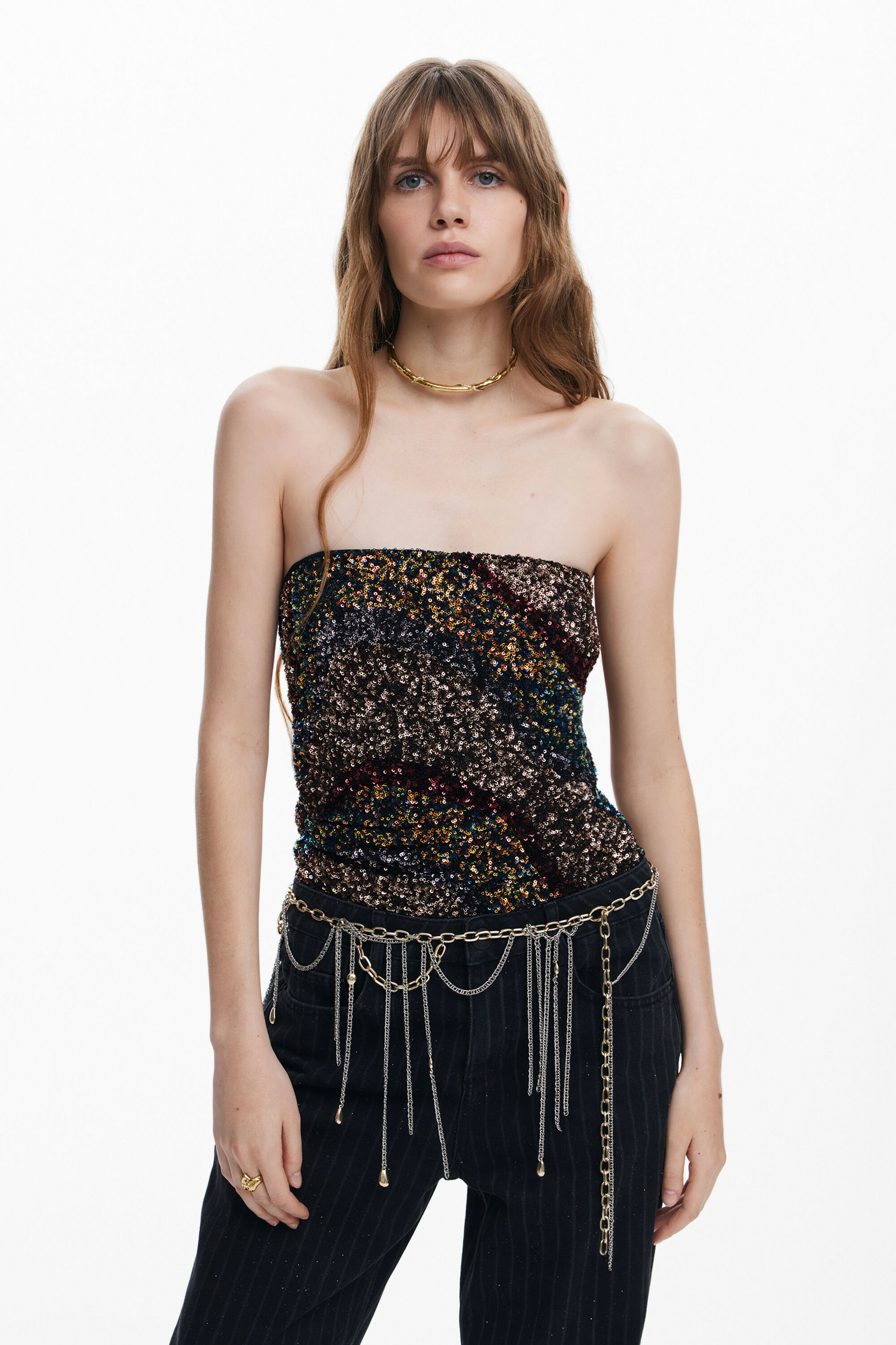 Ce top strapless signé Desigual allie audace et sophistication. Sa coupe épurée met en valeur vos épaules tout en offrant un confort optimal. Les sequins argentés captent la lumière à chaque mouvement, créant un effet glamour et dynamique. Idéal pour composer une tenue chic, il se marie parfaitement avec un pantalon noir ou une jupe taille haute.