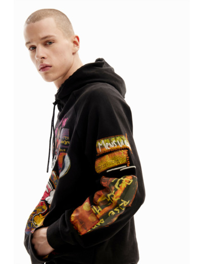 Réponse : Le sweat combine un dessin frontal imprimé avec des patchs et broderies pour un effet texturé.