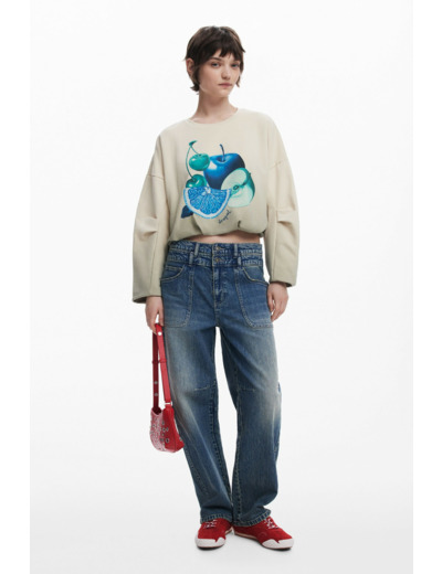Lavage en machine à froid à l’envers, cycle très délicat, pour préserver la qualité des couleurs et la texture du tissu. Col rond classique, manches longues avec volume, ourlet bouffant et imprimé nature morte caractérisent ce modèle signé Desigual.