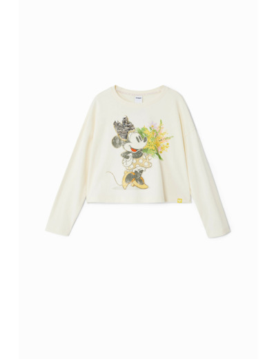 T-shirt manches longues 100 % coton, col rond, imprimé Minnie Mouse avec fleurs. Lavage en machine à l’eau froide, cycle très délicat recommandé pour préserver l’éclat des couleurs et la qualité du tissu.