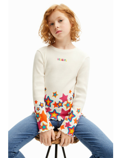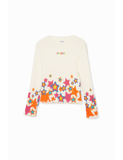 Affichez votre style avec ce T-shirt à manches longues en coton, orné d’un imprimé d’étoiles colorées qui dynamise chaque tenue. Un basique revisité pour illuminer votre quotidien avec élégance et confort.