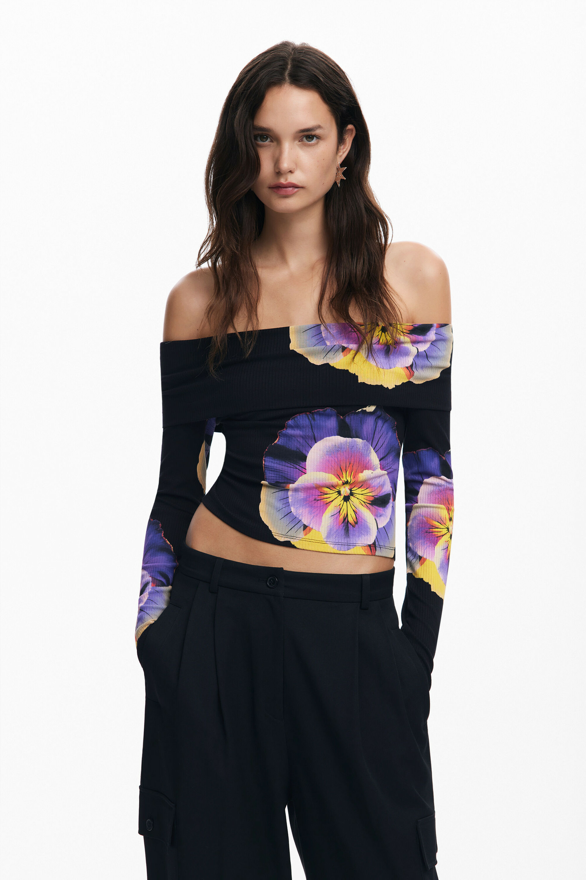 Sublimez votre allure avec ce T-shirt à encolure bardot et manches longues, signé M. Christian Lacroix pour Desigual. Un imprimé floral audacieux qui transforme un basique en pièce d’exception.