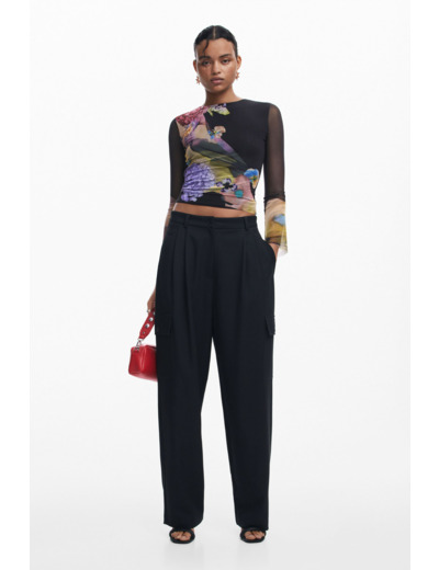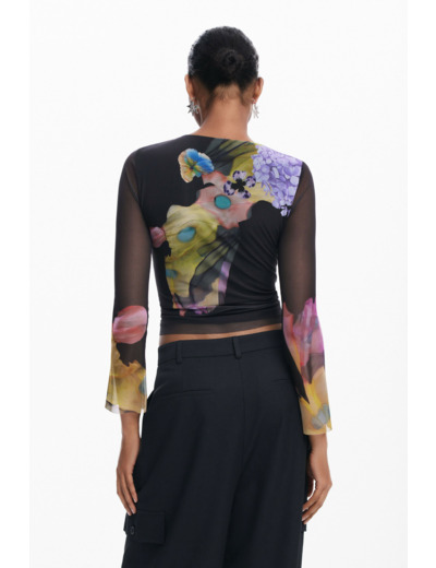 Fabriquée par Desigual, cette blouse se lave en machine à froid à l’envers, sur un cycle très délicat, pour préserver la finesse du tulle et la richesse des couleurs. Elle appartient à la catégorie T-shirt long sleeve, alliant style et praticité.