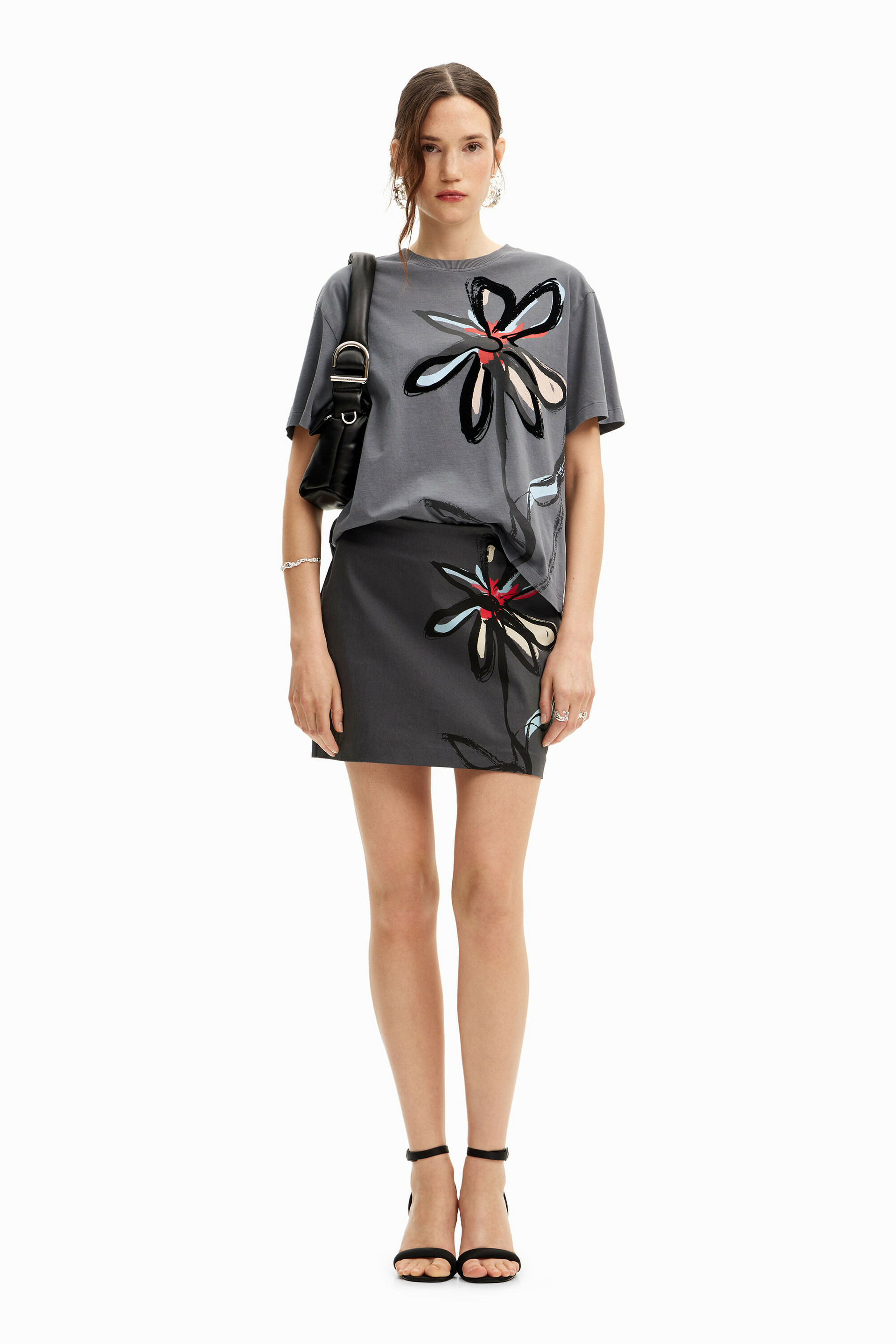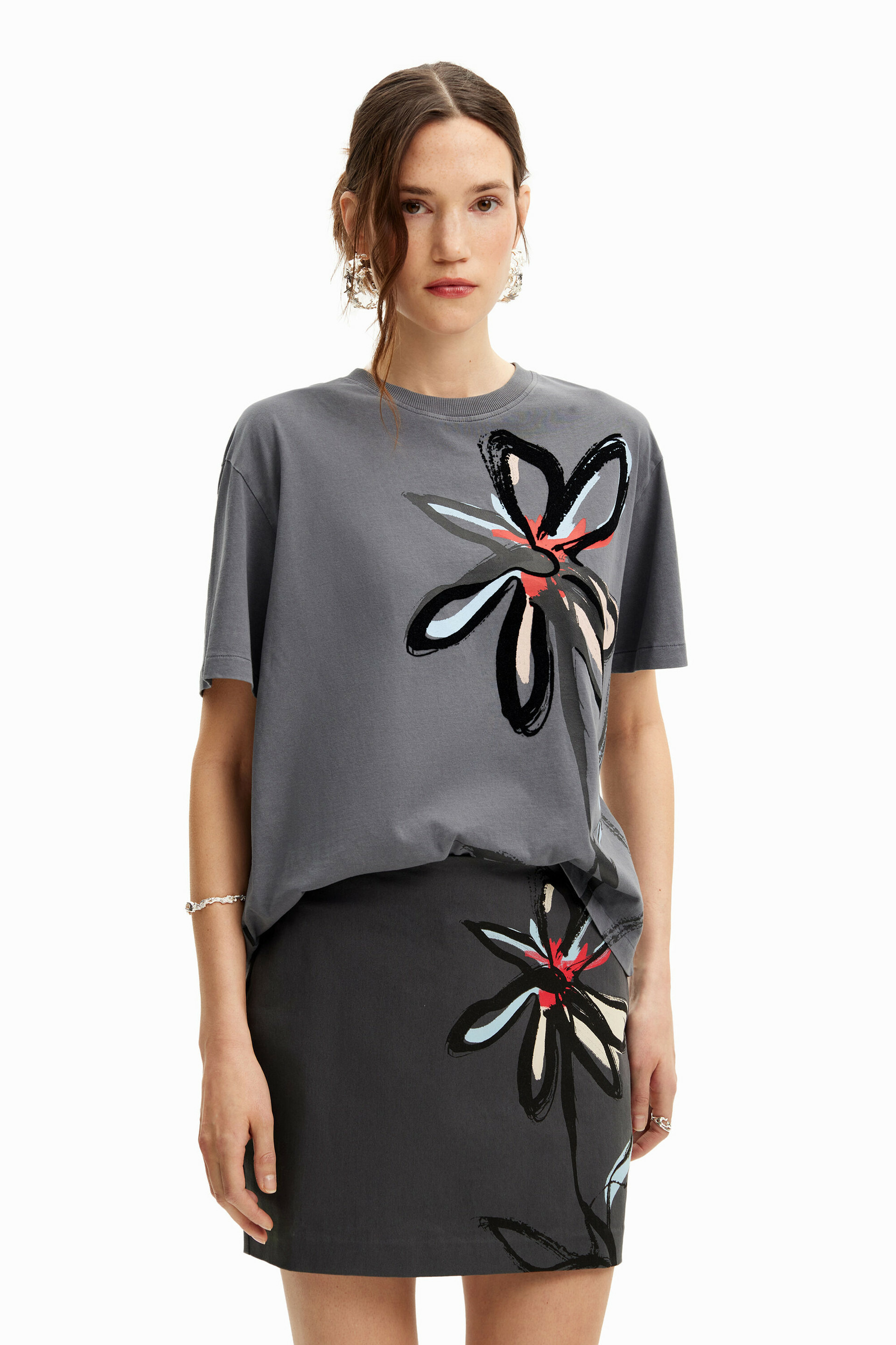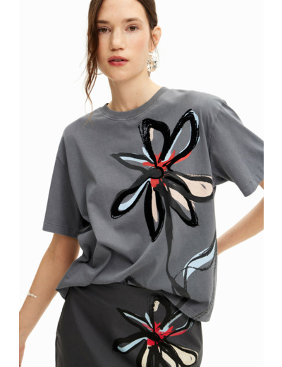 Lavage en machine à froid à l’envers, cycle délicat. T-shirt à manches courtes, col rond, effet usé, illustration fleur peinte à la main sur le devant. Matière et composition non spécifiées.