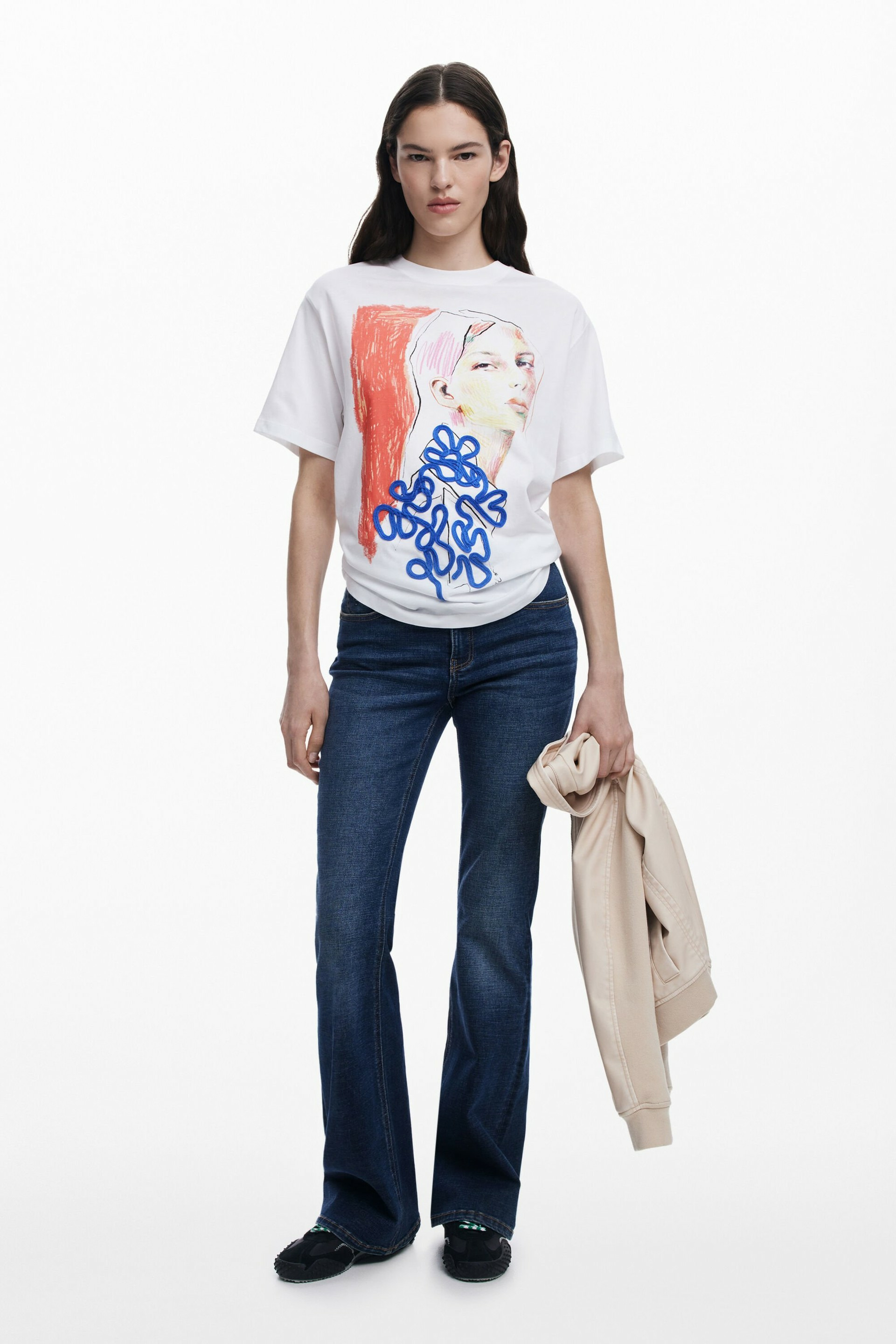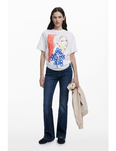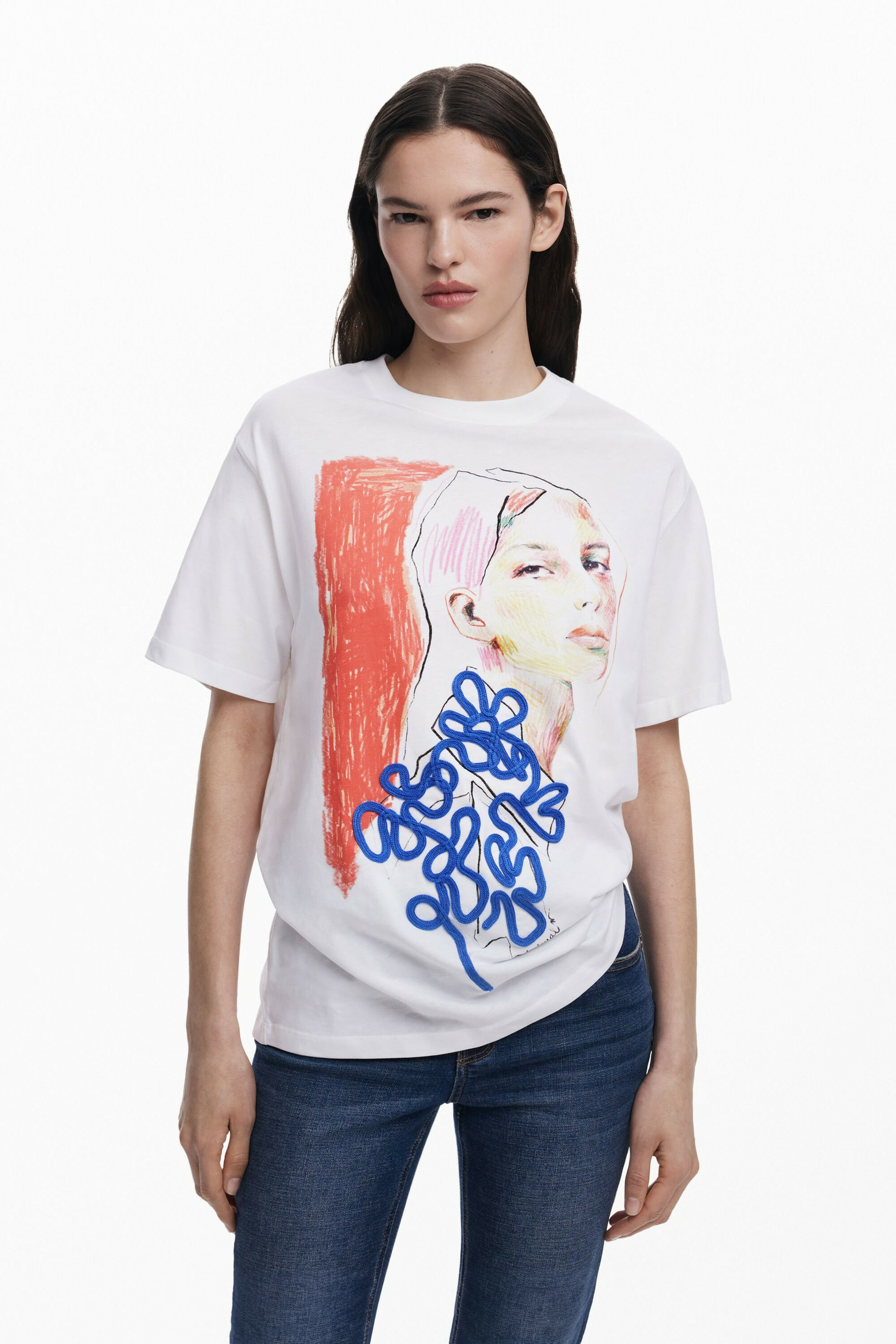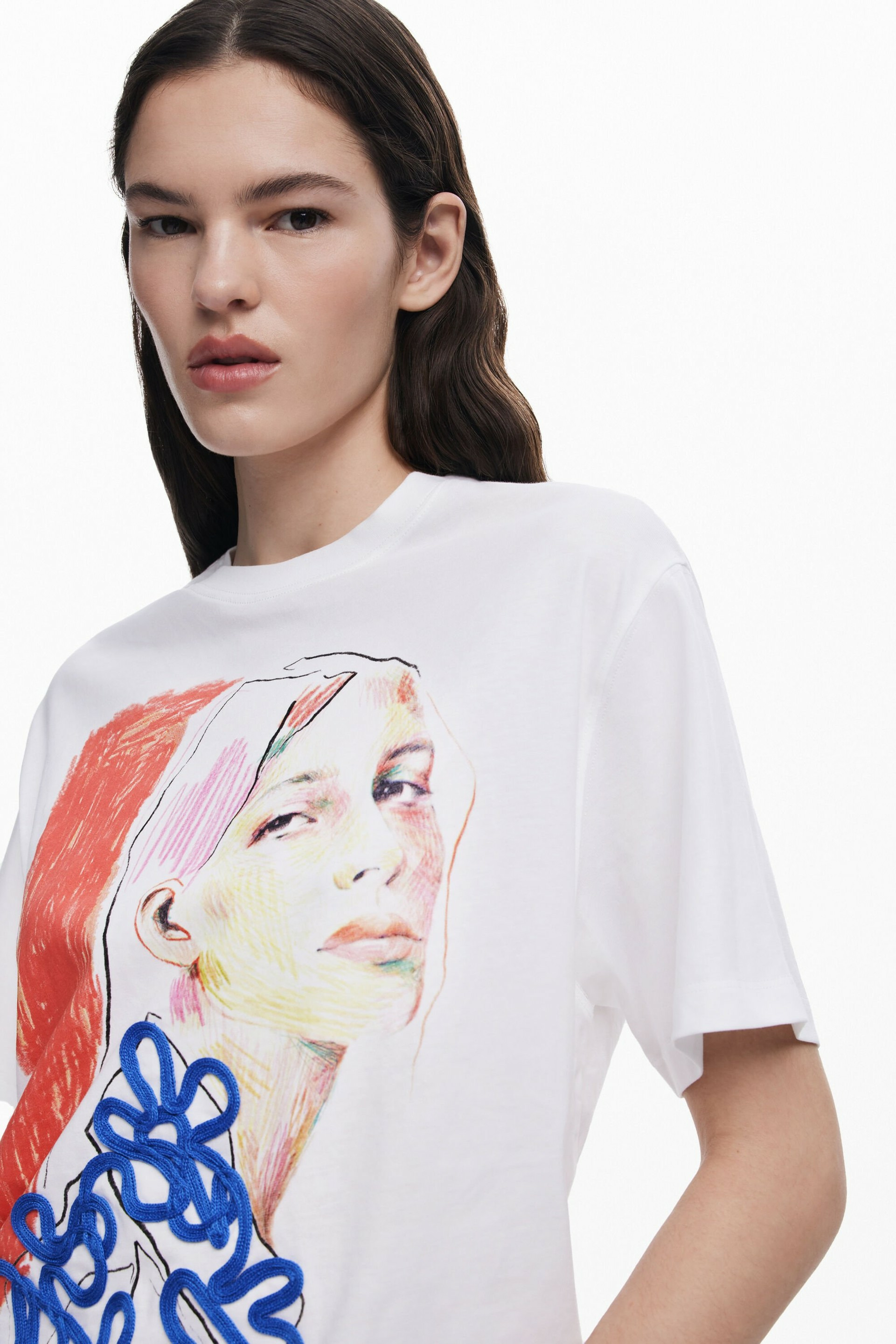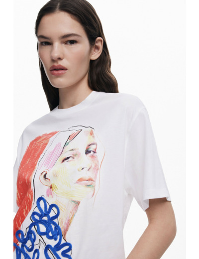 Affirmez votre style avec ce T-shirt en coton à manches courtes, sublimé par un imprimé visage féminin unique et un détail d’application de cordon qui apporte une touche d’originalité. Une pièce incontournable pour allier confort et audace au quotidien.