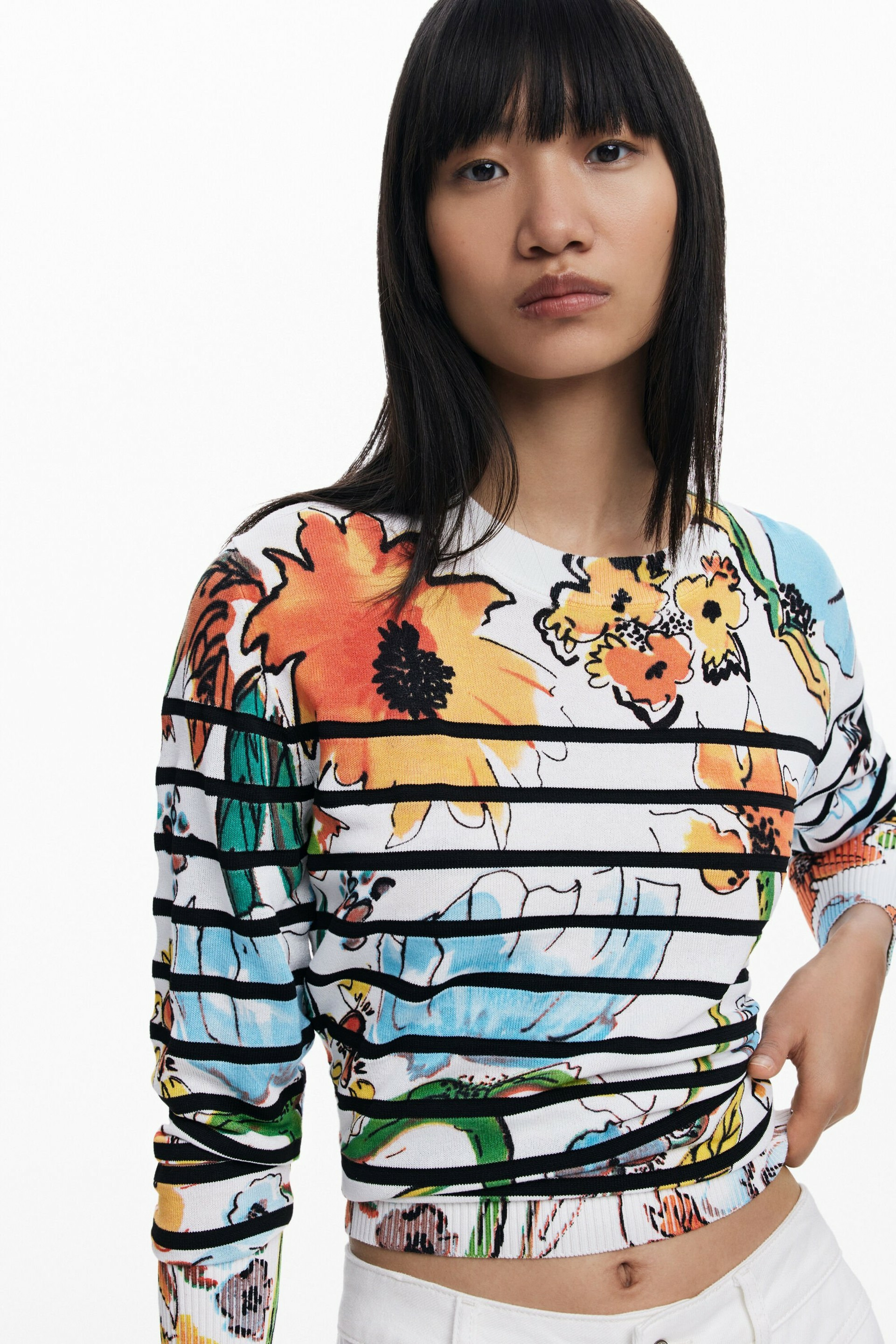 Affirmez votre style avec ce T-shirt à manches courtes et col rond, sublimé par un imprimé original mêlant lettres, messages et dessins ludiques. Une pièce qui insuffle une touche d’audace et de bonne humeur à votre garde-robe.