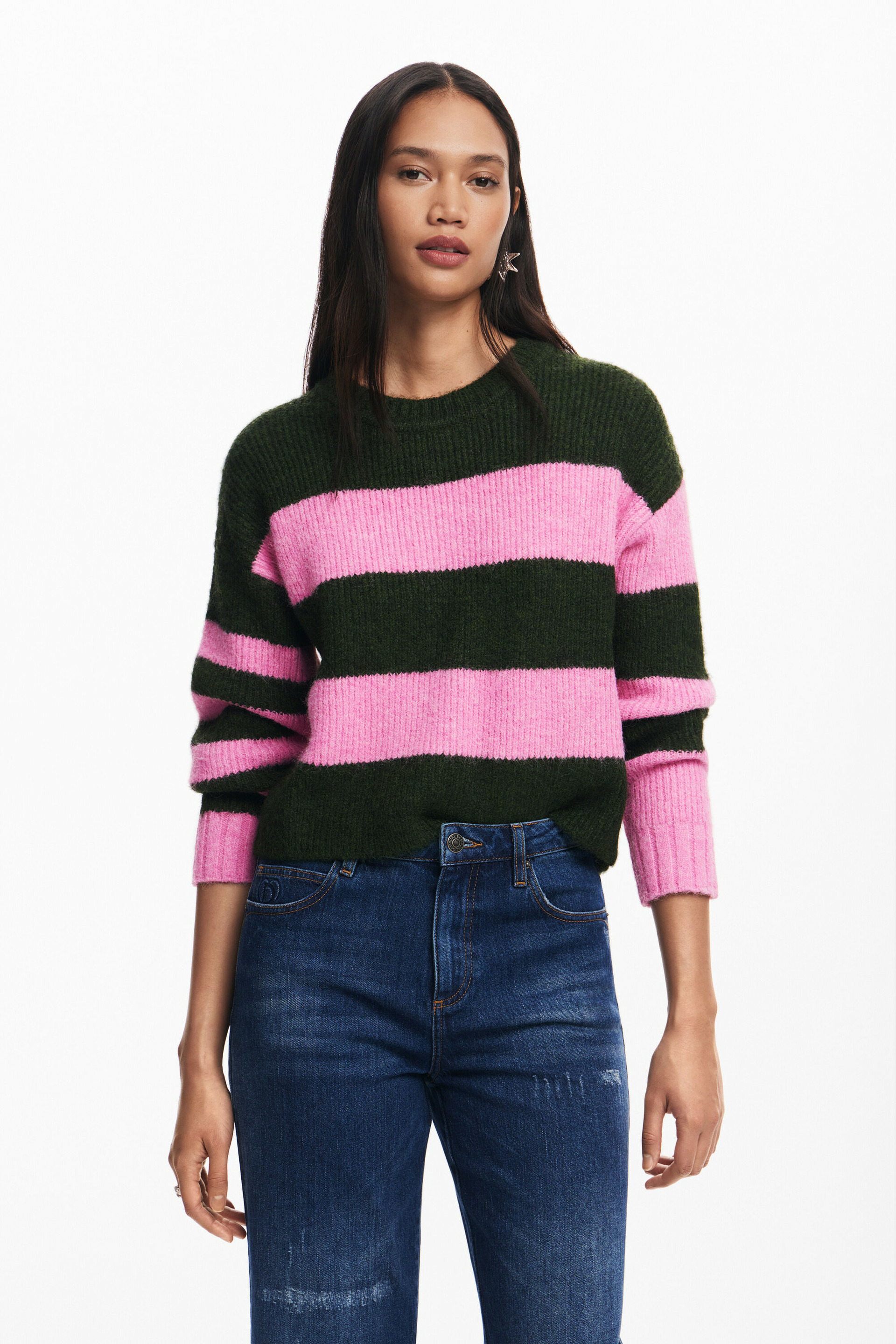 Adoptez l’élégance décontractée avec ce pull à manches longues et col rond signé Desigual. Son imprimé rayé bicolore apporte une touche moderne et dynamique à votre garde-robe.