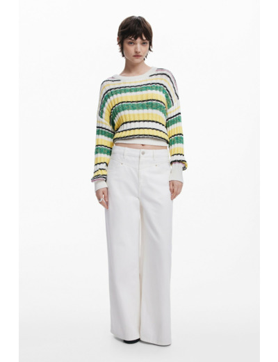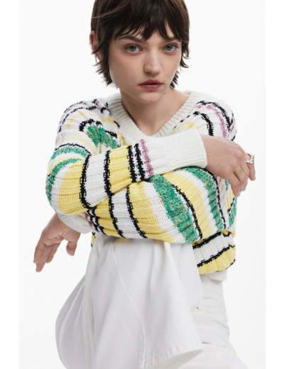 Fabriqué dans une maille fine (thin gauge), ce pull présente un col rond et des manches longues. Le lavage doit s’effectuer en machine à froid, cycle très délicat, et à l’envers pour préserver l’éclat des rayures et la texture de la maille. Marque : Desigual.