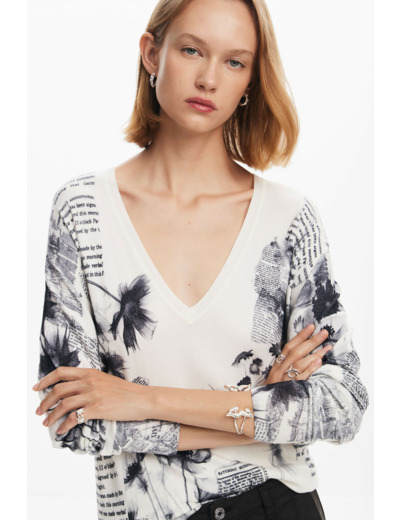 Laissez-vous séduire par ce pull en maille fine, sublimé par un col en V élégant et un imprimé floral mêlé à des textes graphiques. Une pièce unique qui apporte fraîcheur et caractère à votre garde-robe.
