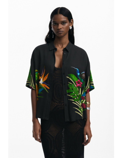 Affichez un style estival affirmé avec cette chemise à manches courtes au fond uni rehaussé de détails floraux hawaïens. Sa coupe décontractée et sa fermeture à boutons en font un incontournable du dressing estival.