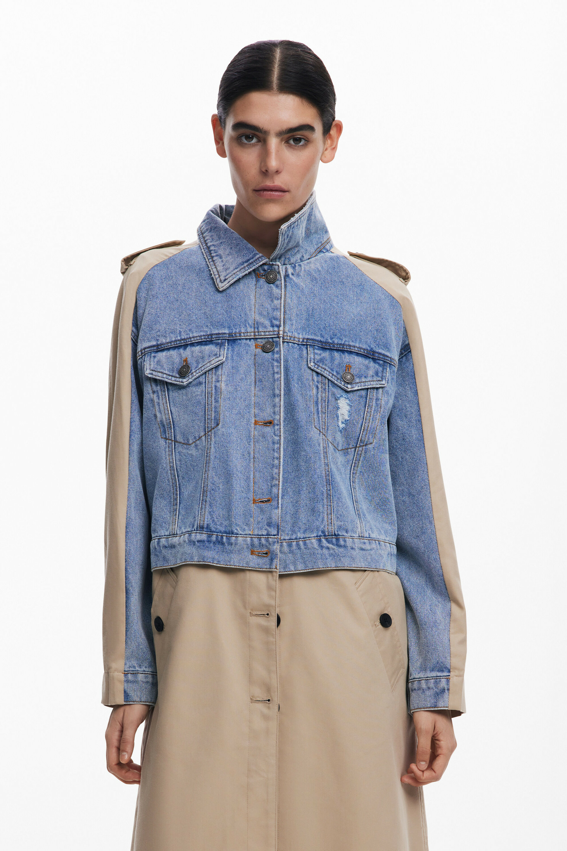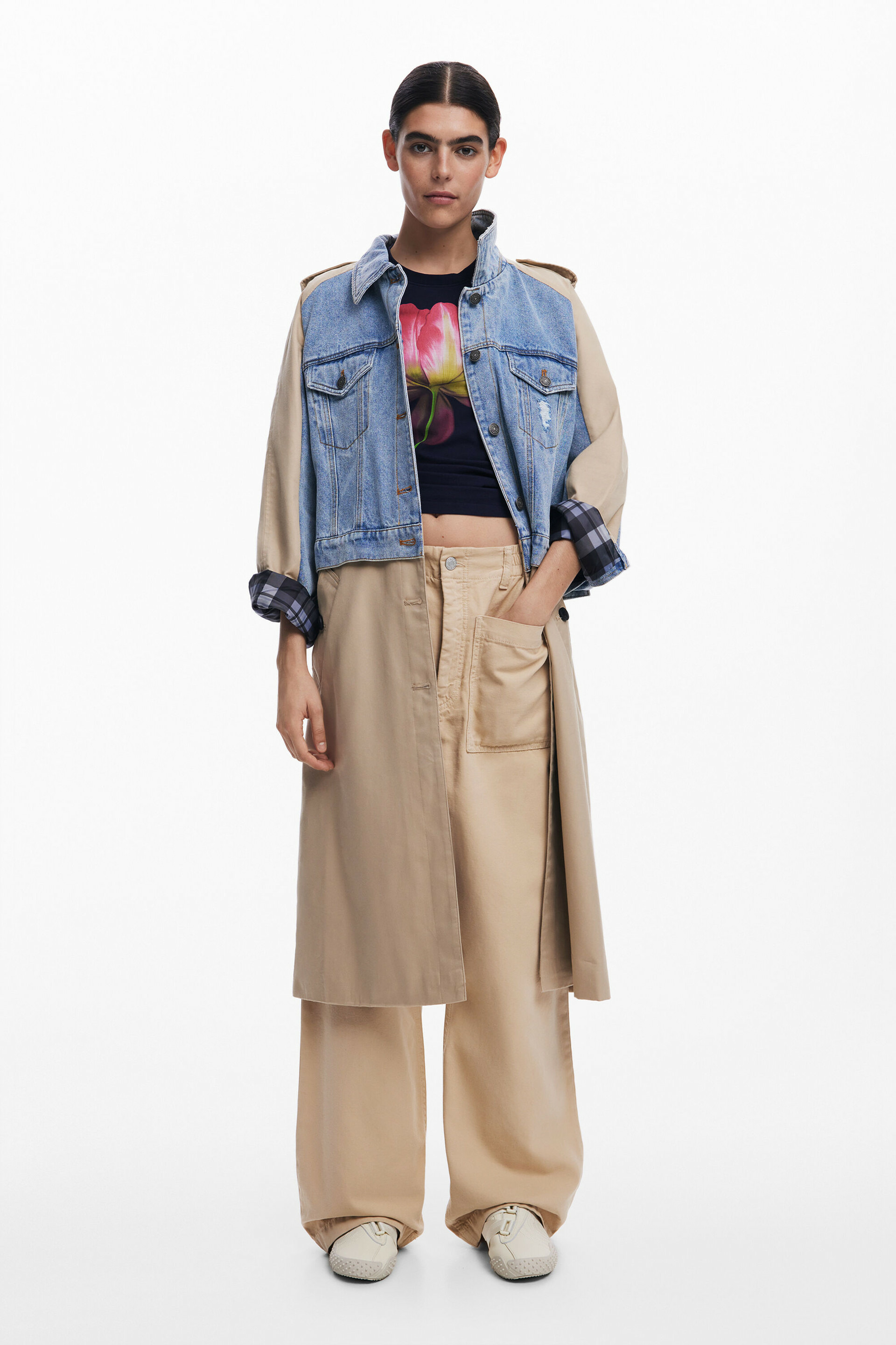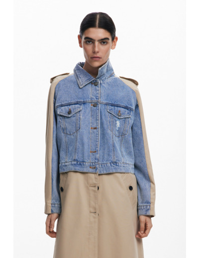 Alliez audace et élégance avec ce trench-coat unique signé Desigual, où le classique rencontre l’esprit denim. Une pièce qui redéfinit le layering avec sa veste en jean trucker intégrée sur le haut et les manches.