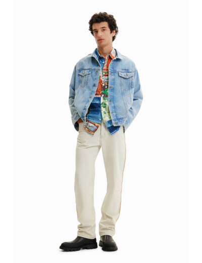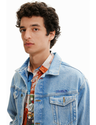 Affirmez votre style avec cette veste "trucker" en jean au délavé unique, sublimée par des broderies contrastantes qui racontent une histoire entre plage et pingouïns. Une pièce Desigual qui allie audace et originalité pour un look urbain et décontracté.