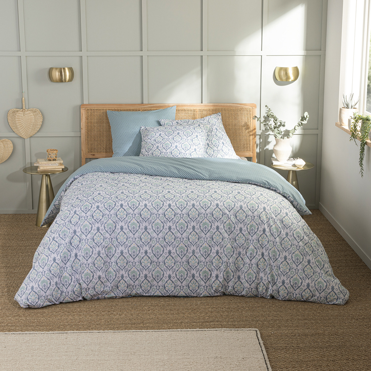 L'imprimé turquoise et marine, orné de fleurs stylisées d'inspiration orientale, ajoute une touche d'élégance artistique à votre chambre. La face réversible présente un motif de croisillons marine et turquoise pour une sophistication supplémentaire.